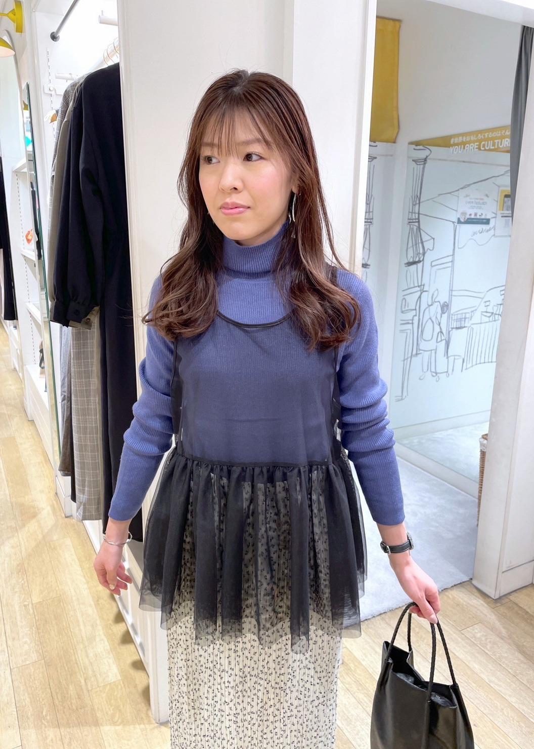 インナーにはアクセントに綺麗なブルー系のタートルニットを合わせました!