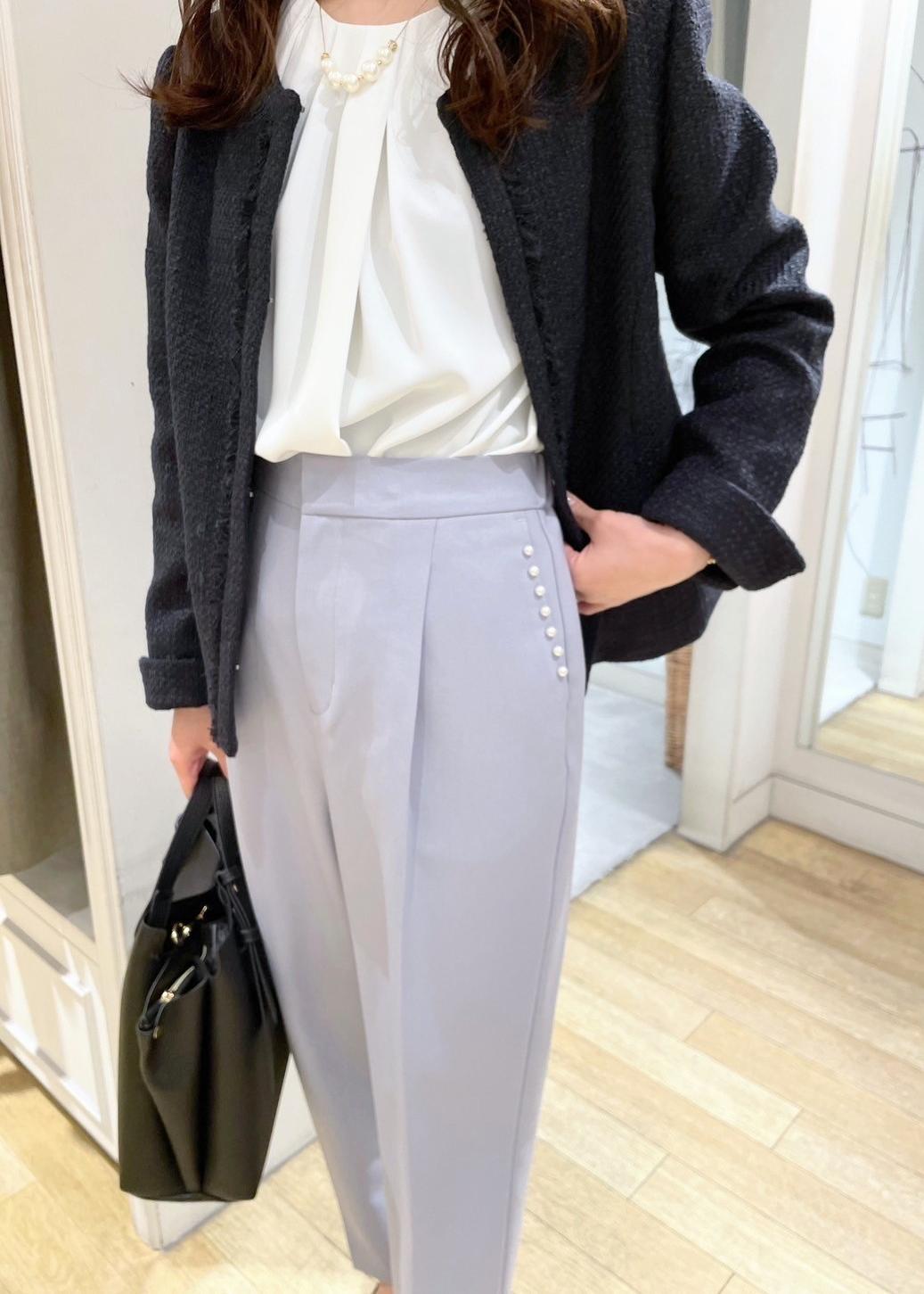 上品なネイビーのツイードジャケットに、白ブラウス、サックスブルーのテーパードパンツを合わせた、卒業シーズンにぴったりなセレモニースタイル!