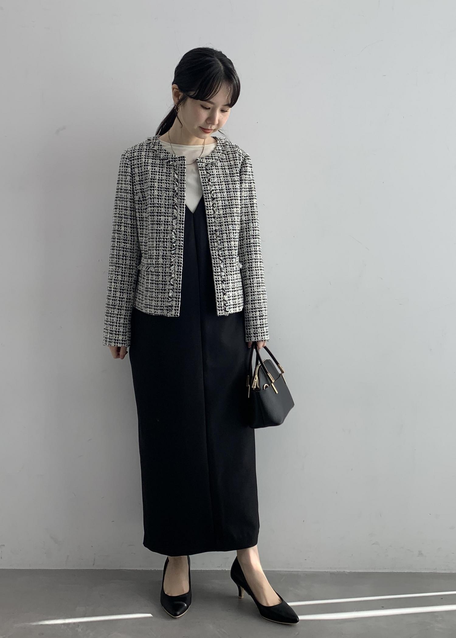 ツイードのジャケットを羽織ればセレモニーにもおすすめな綺麗めスタイルに。