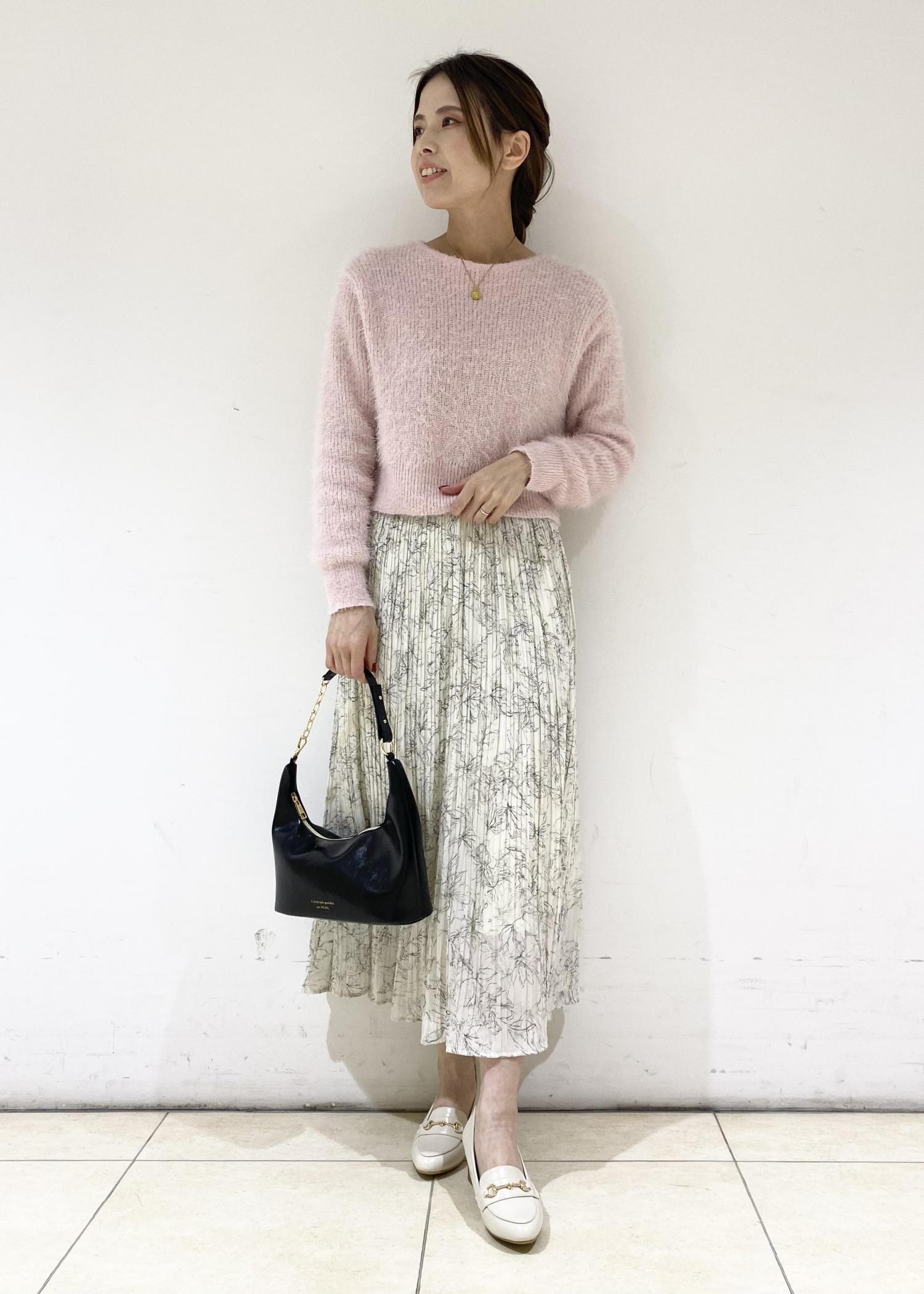 ピンクニットに軽やかなプリーツスカートを合わせたきれいめカジュアルスタイリング♪