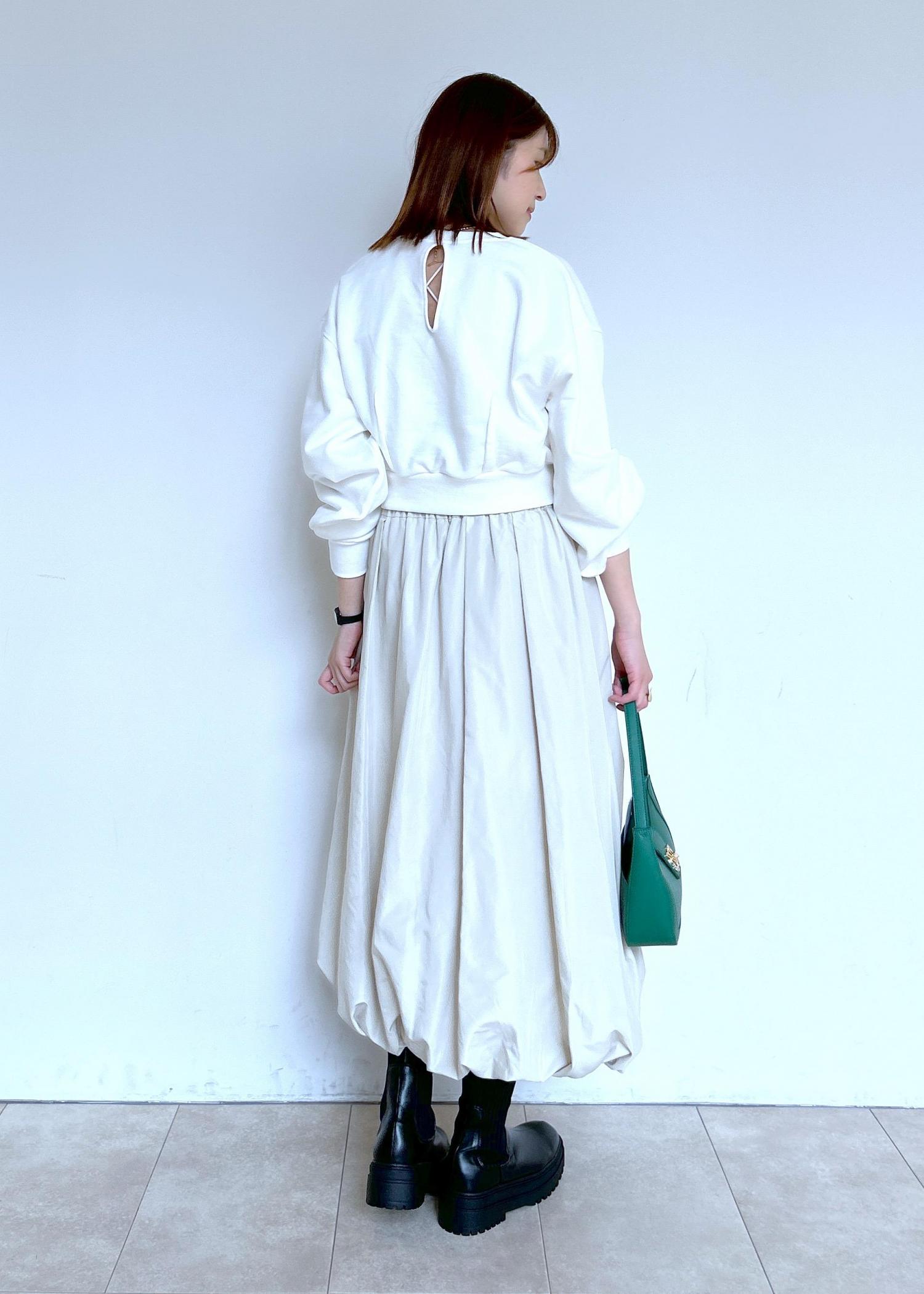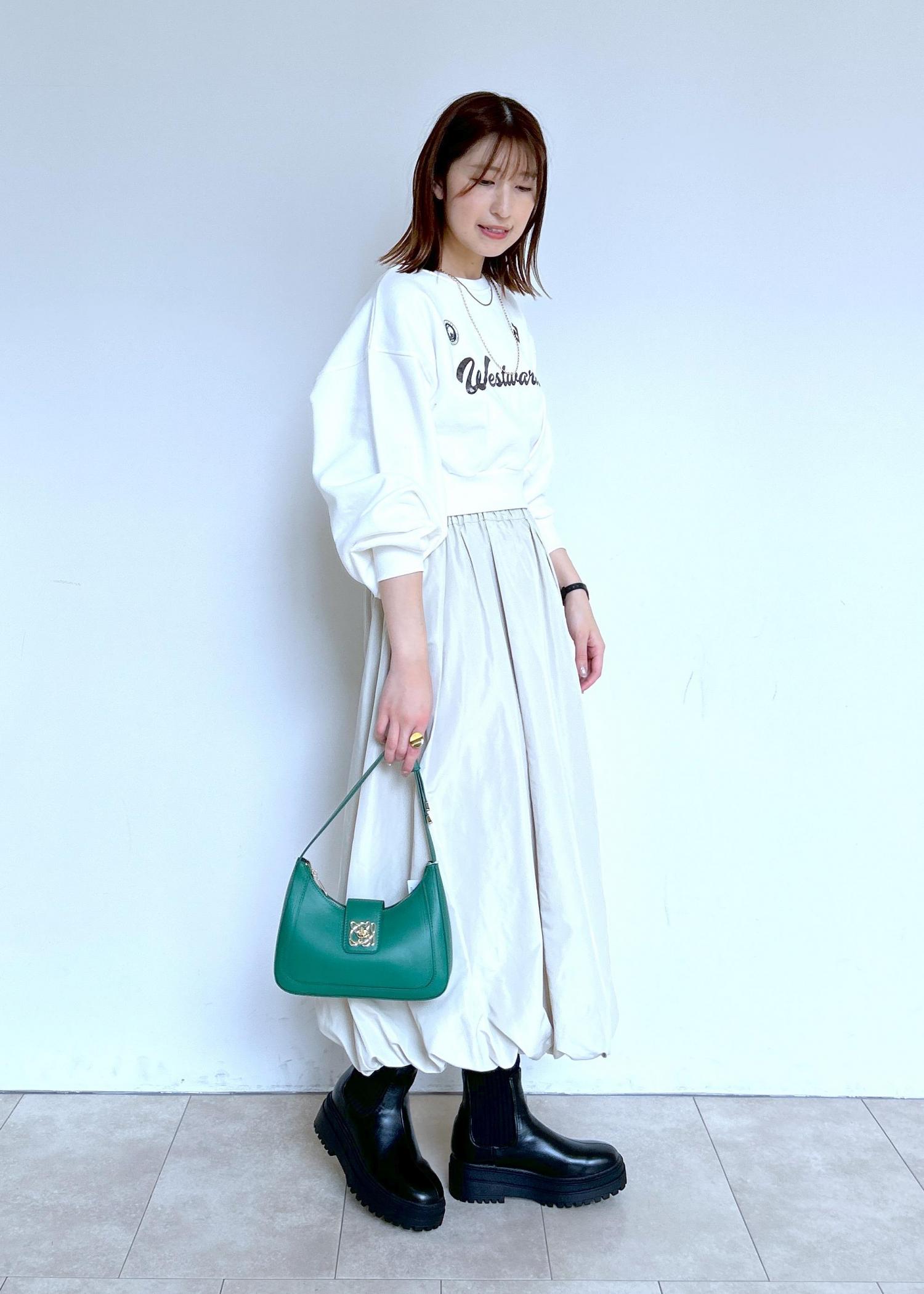 ロゴスウェットはカジュアルになりすぎないように、スカート合わせで女性らしさをプラスしました。
