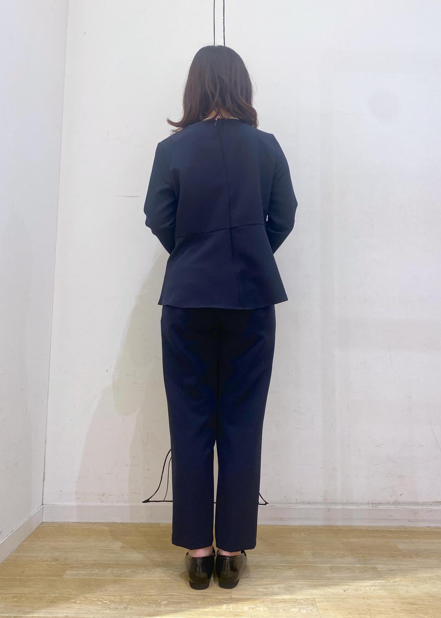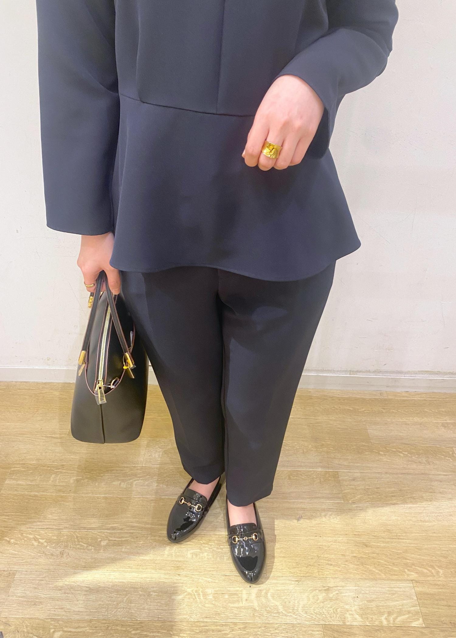 ペプラムブラウスとテーパードパンツのセットアップコーデです。