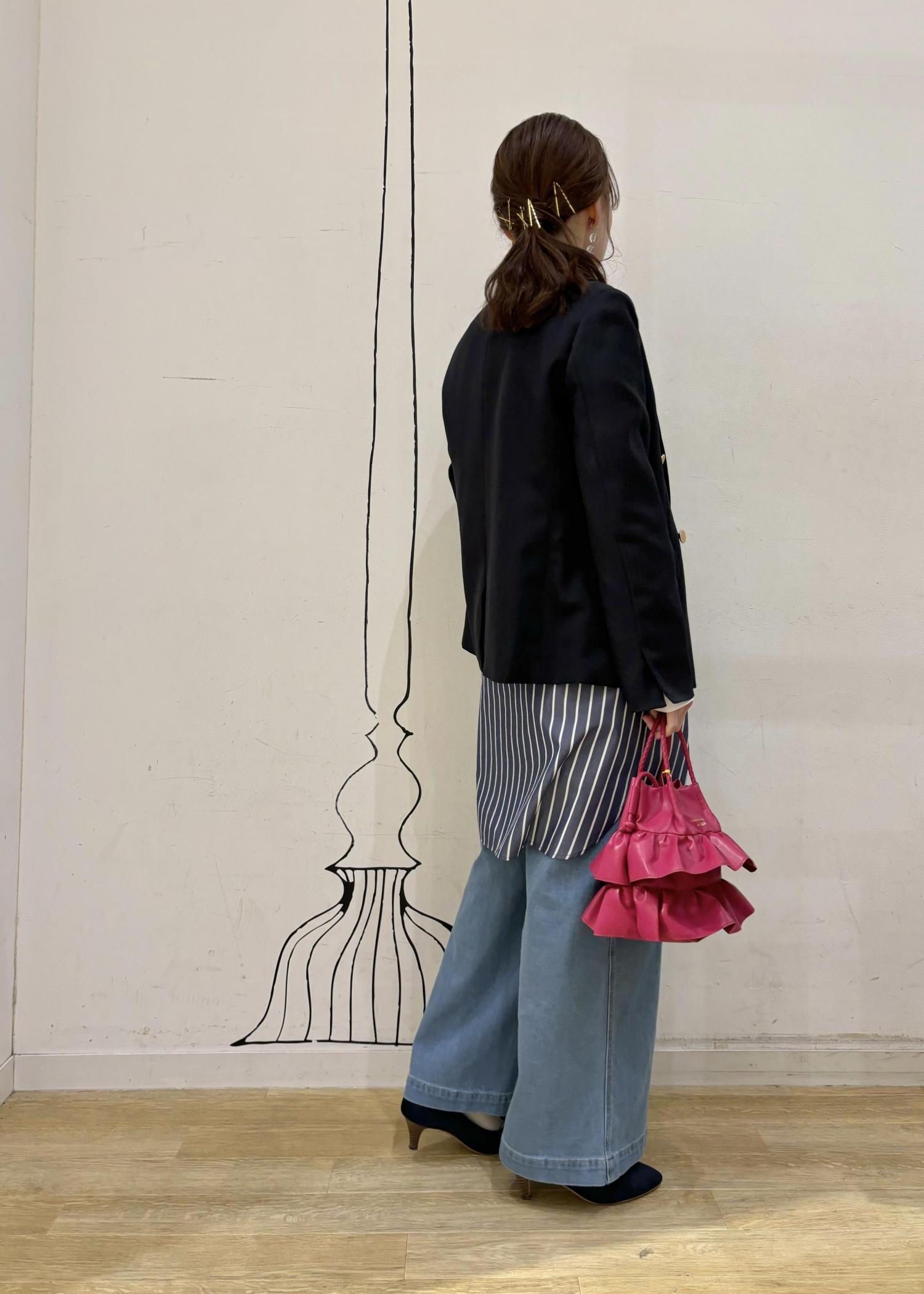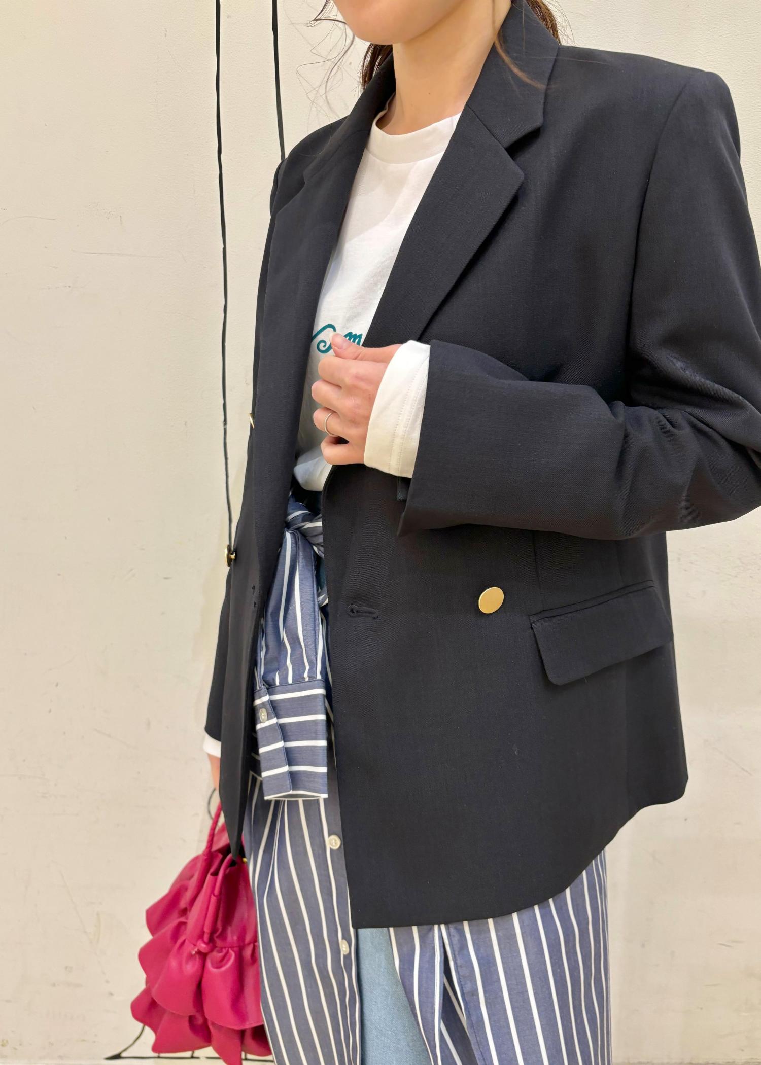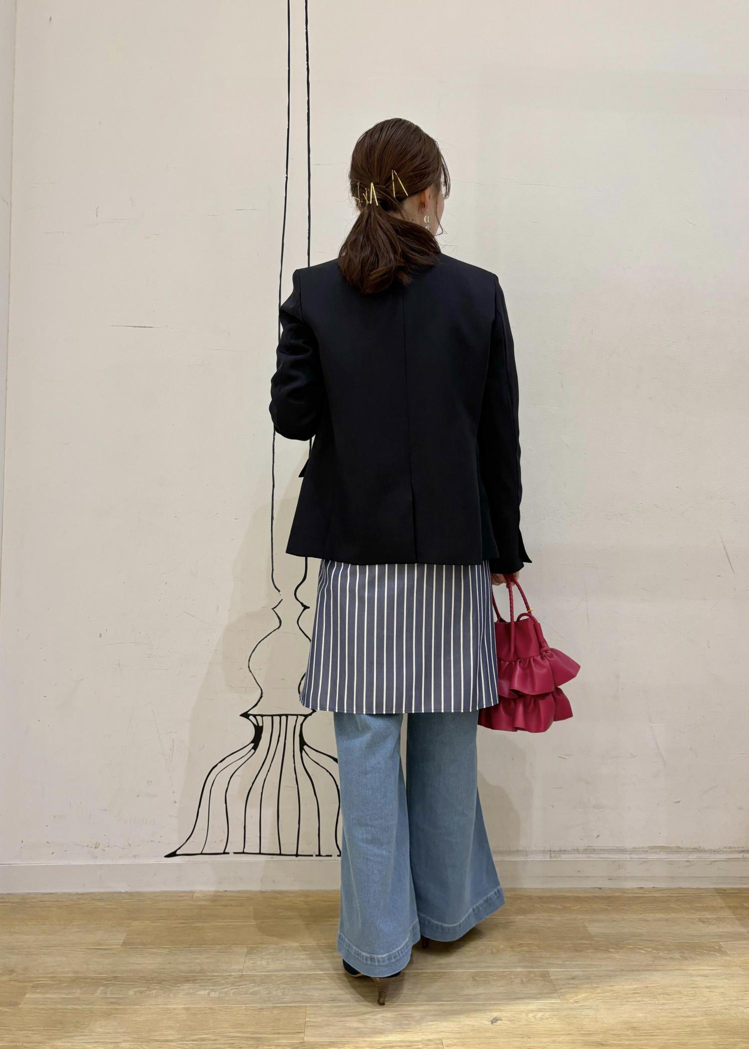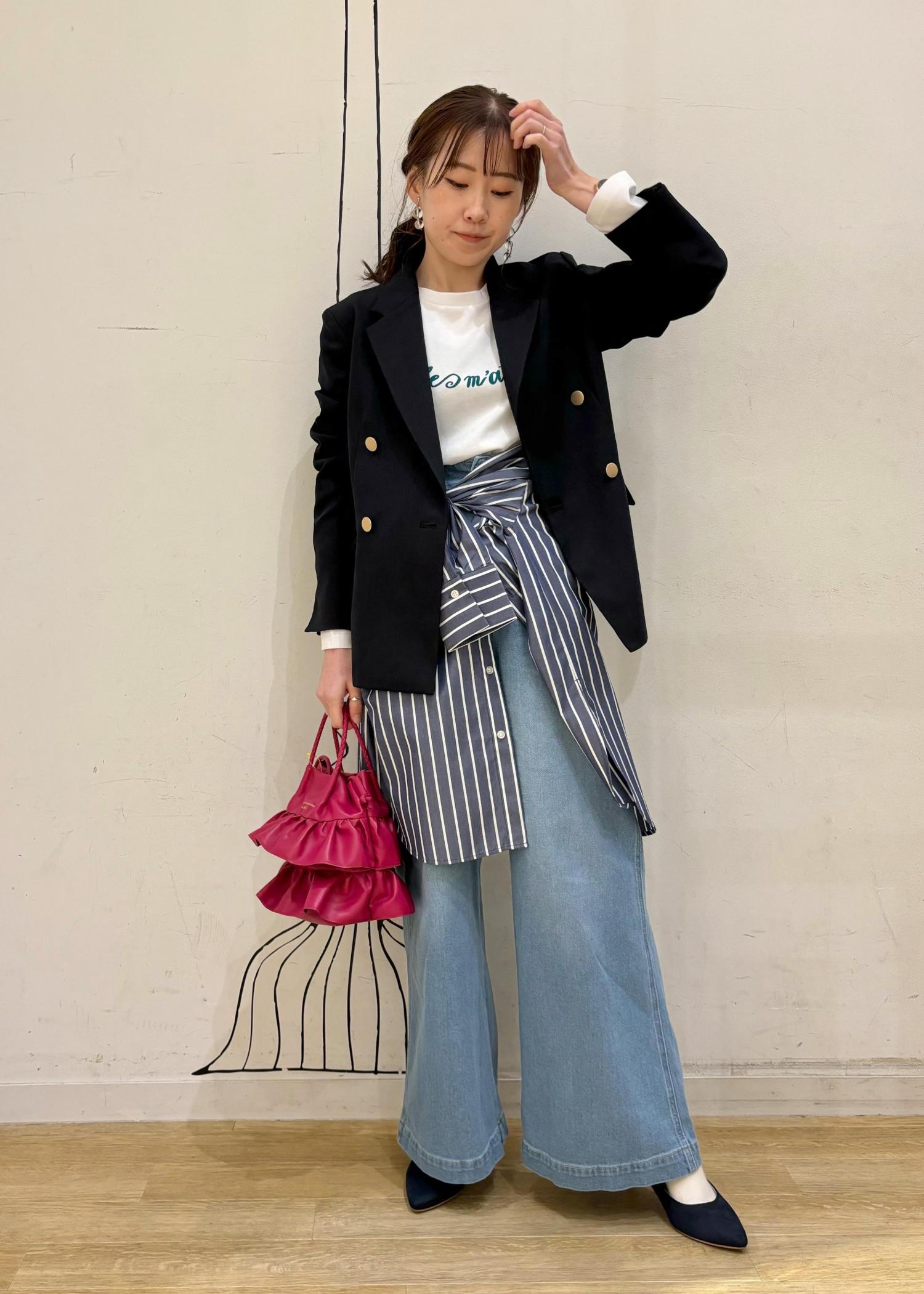 ジャケット×デニムのシンプルコーデにストライプシャツを加えてアクセントに。ジャケットはお仕事にもお使い頂けますがオフの日のお出かけにおすすめの大人カジュアルコーデです。