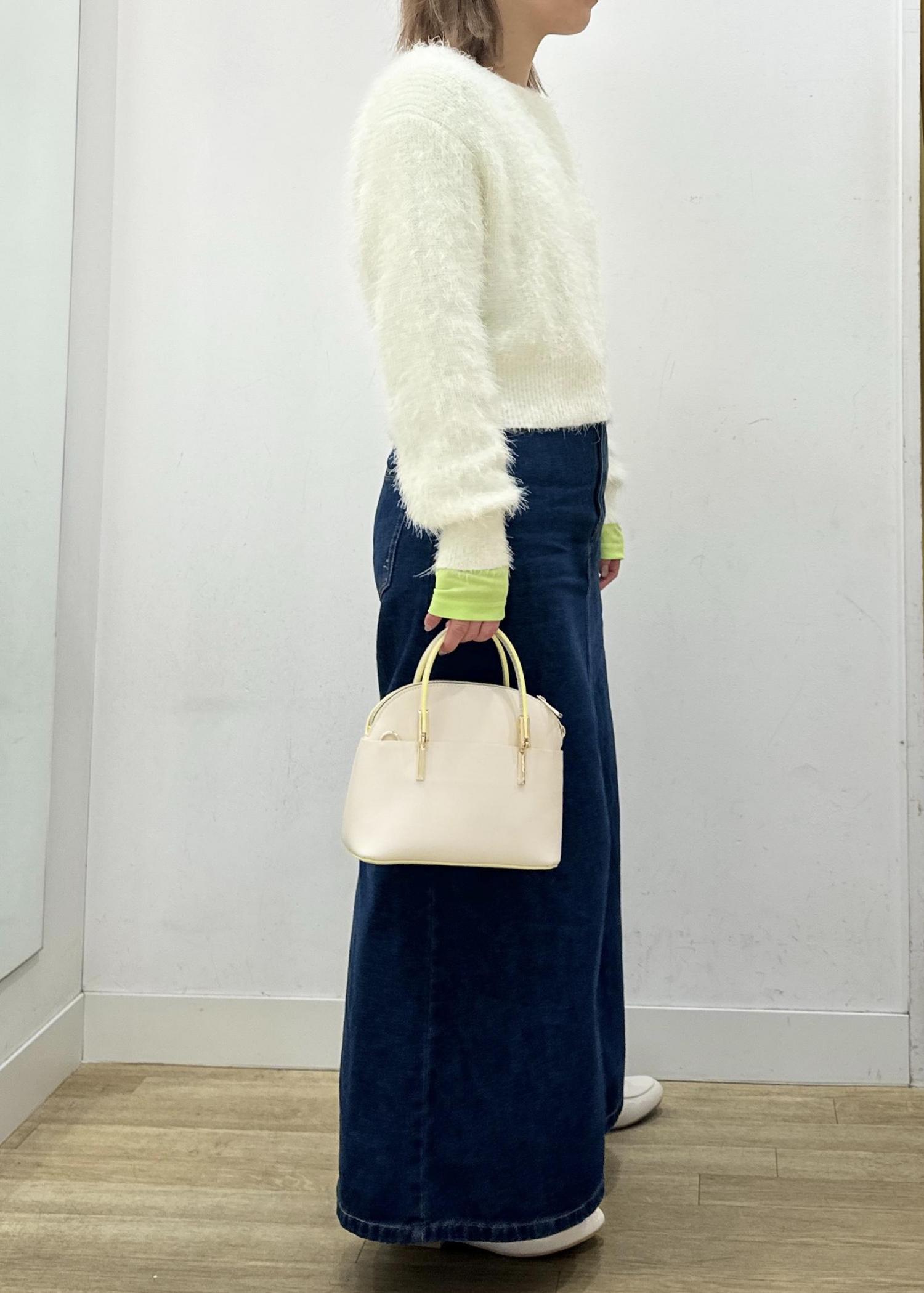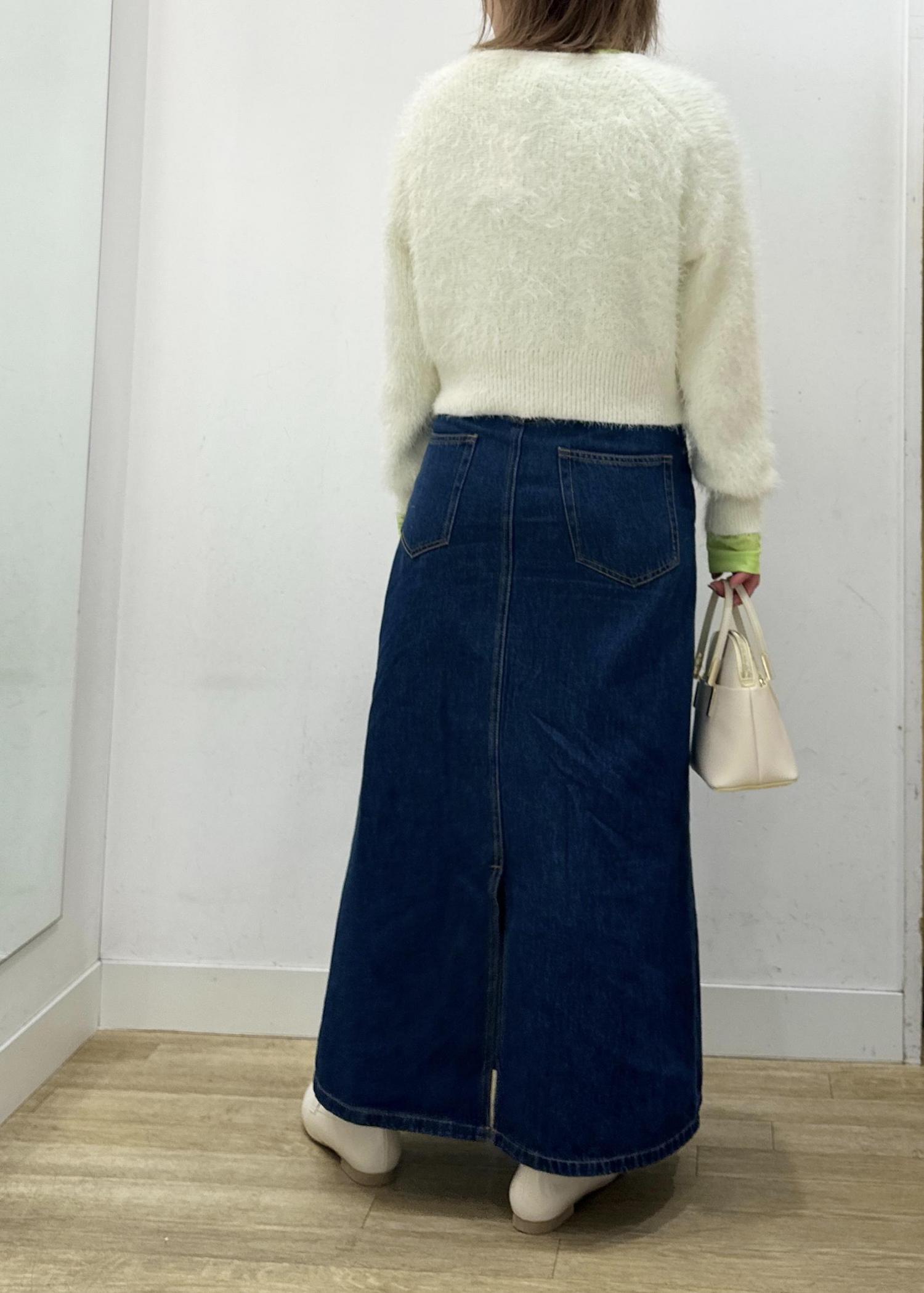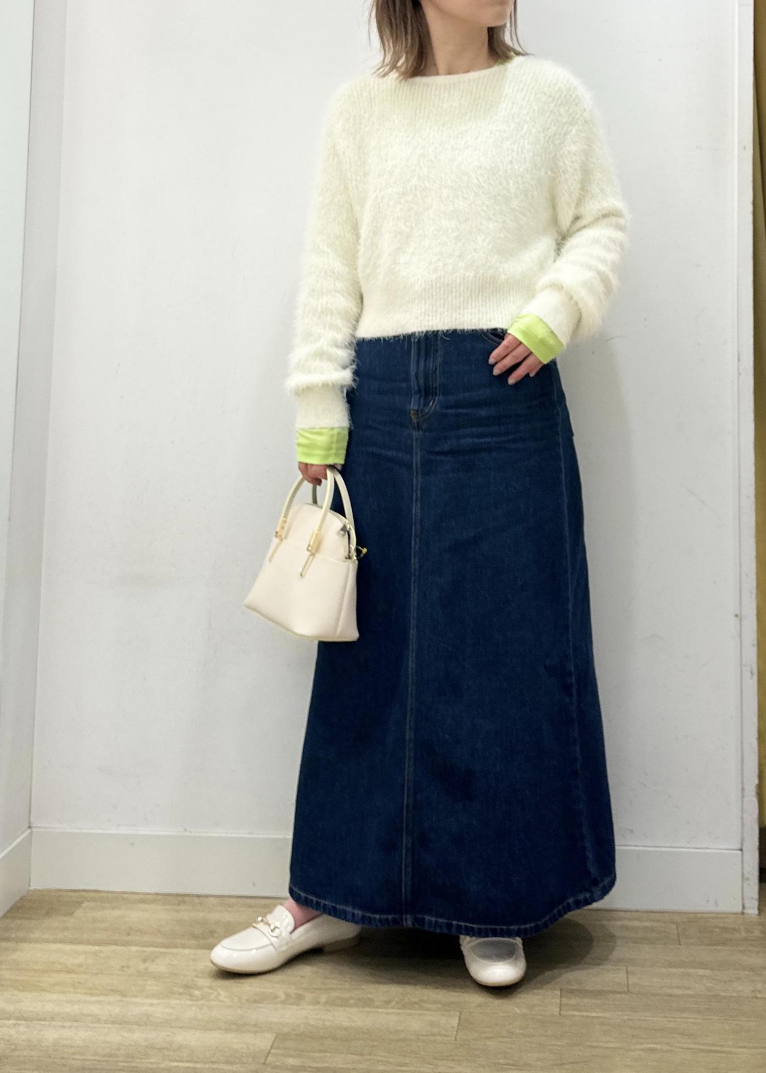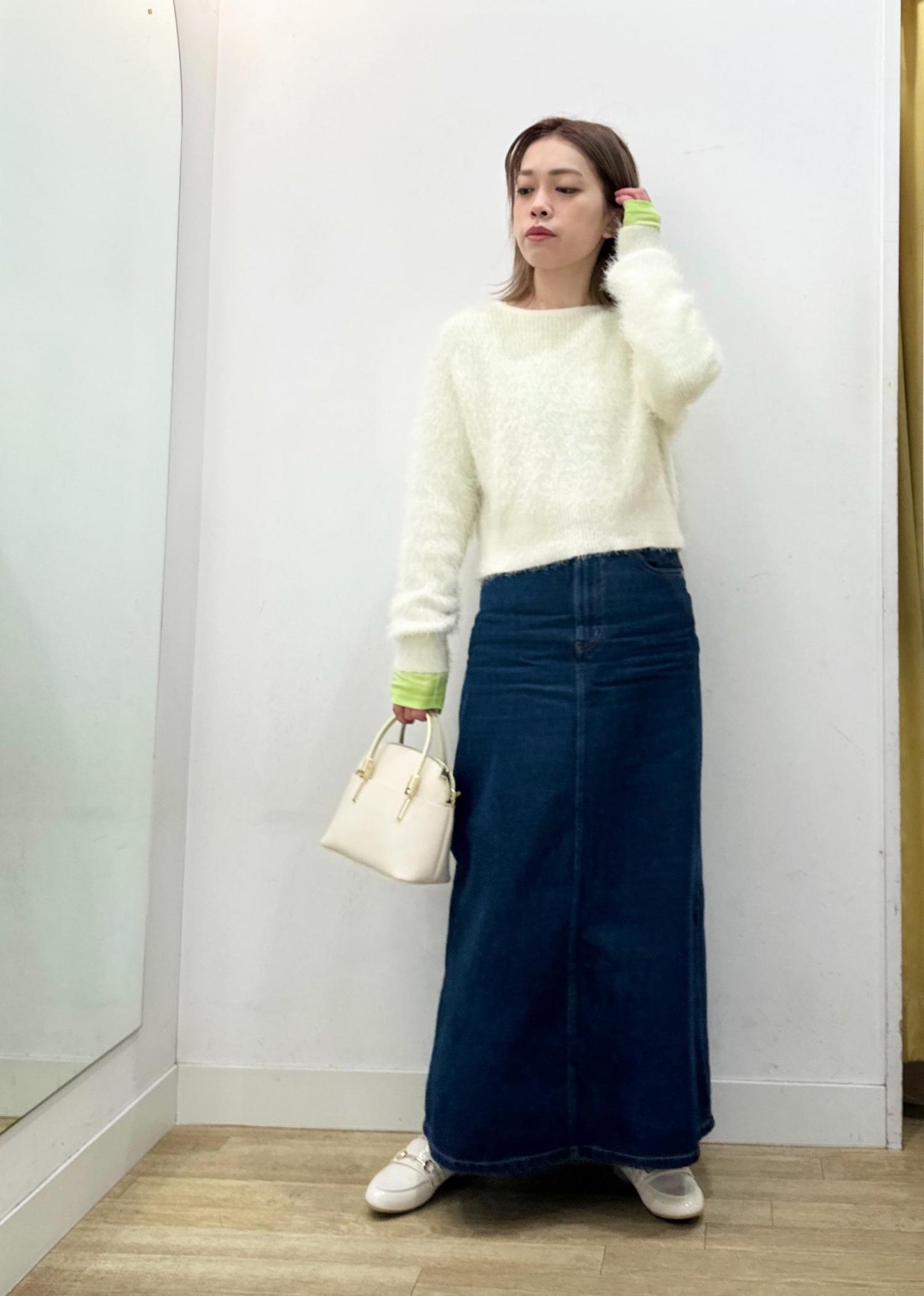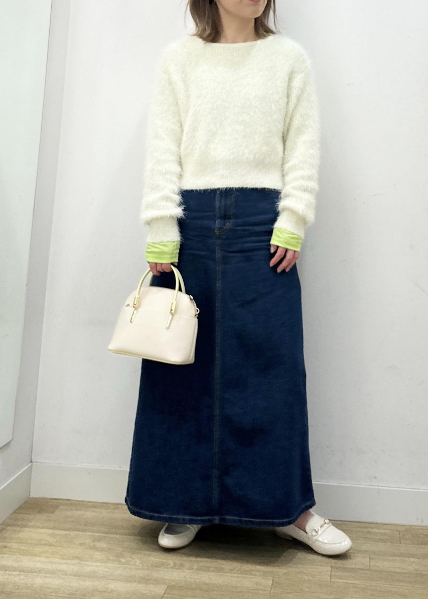 ホワイトカラーのシャギーニットに、定番のデニムを合わせたスタイリング!