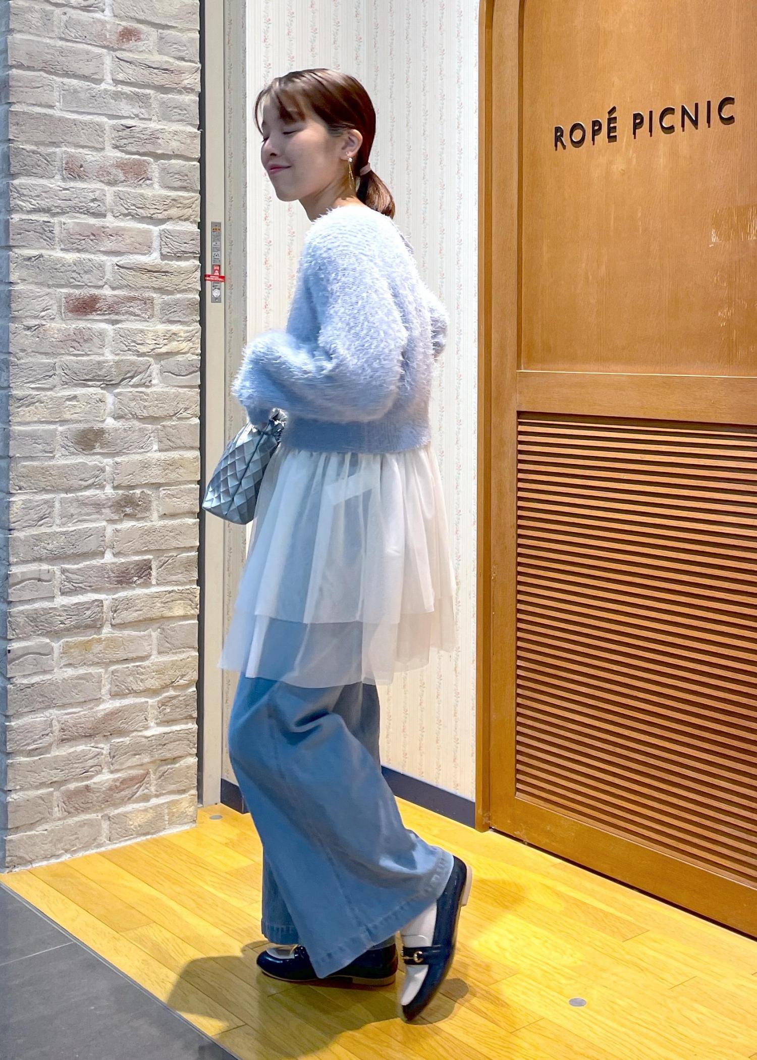ふわふわ感が可愛いブルーのフェザーニットに、チュールトップスを重ねた甘めスタイルです!