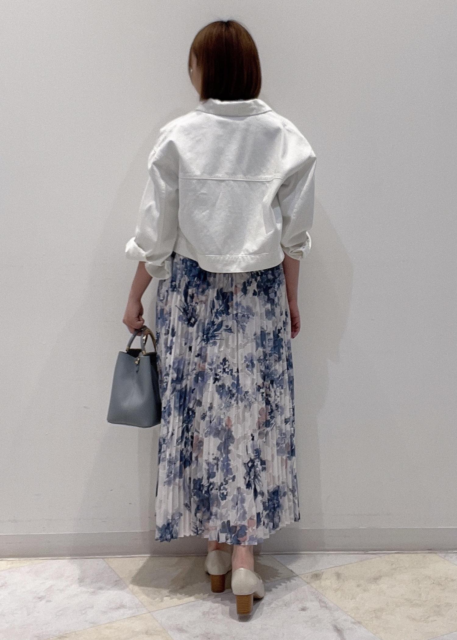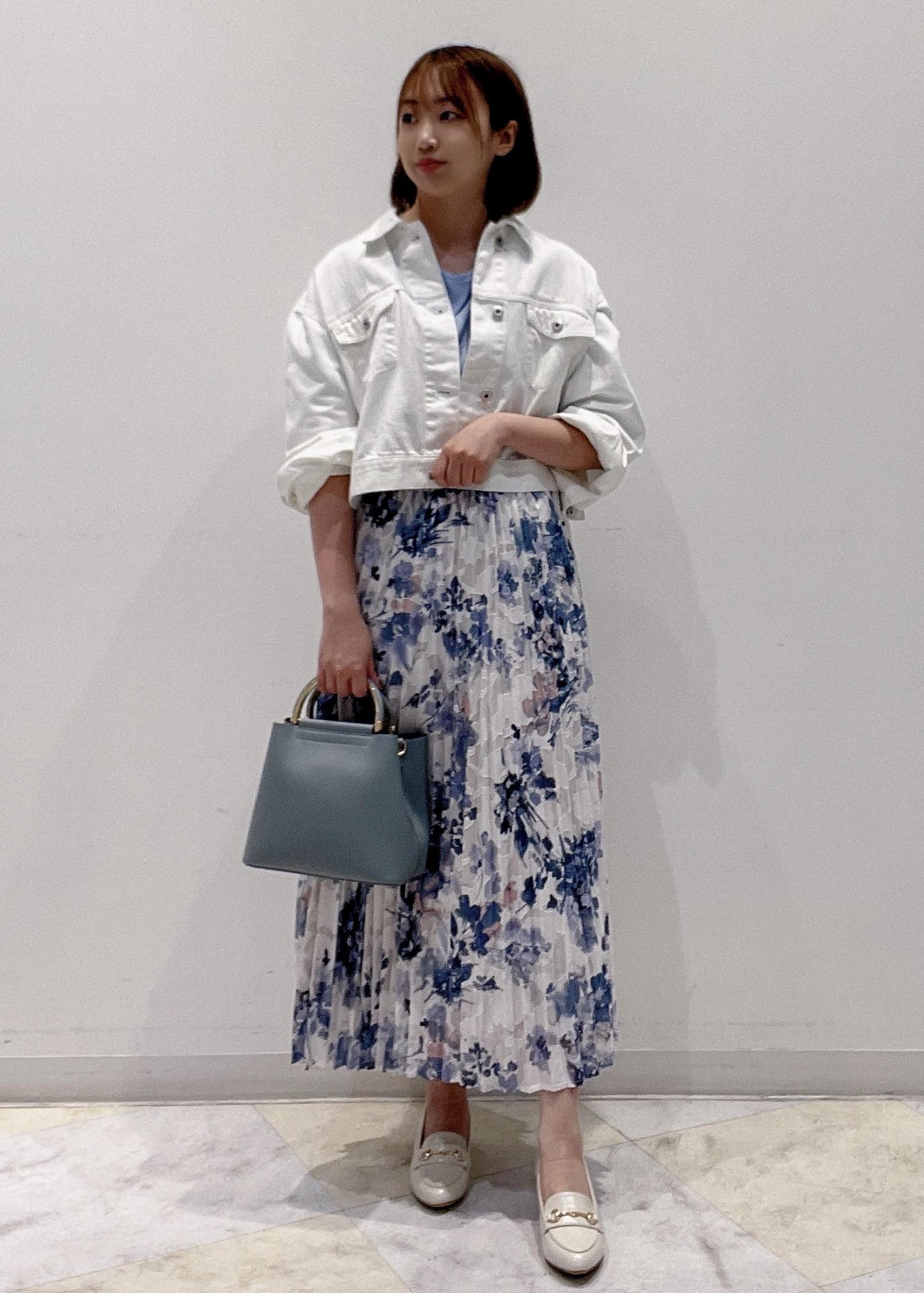 白のデニムジャケットは丈が短めでスカートとも合わせやすく、ハードな印象のデニムジャケットも白と花柄を合わせることで、女性らしい印象に。