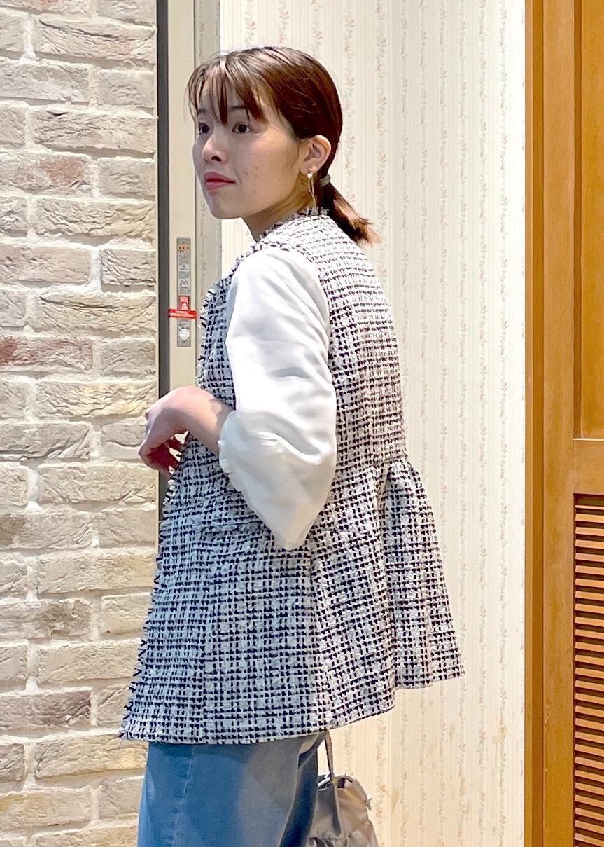 華やかさのあるツイードベストにチュールのトップスを合わせて甘めスタイルに!!