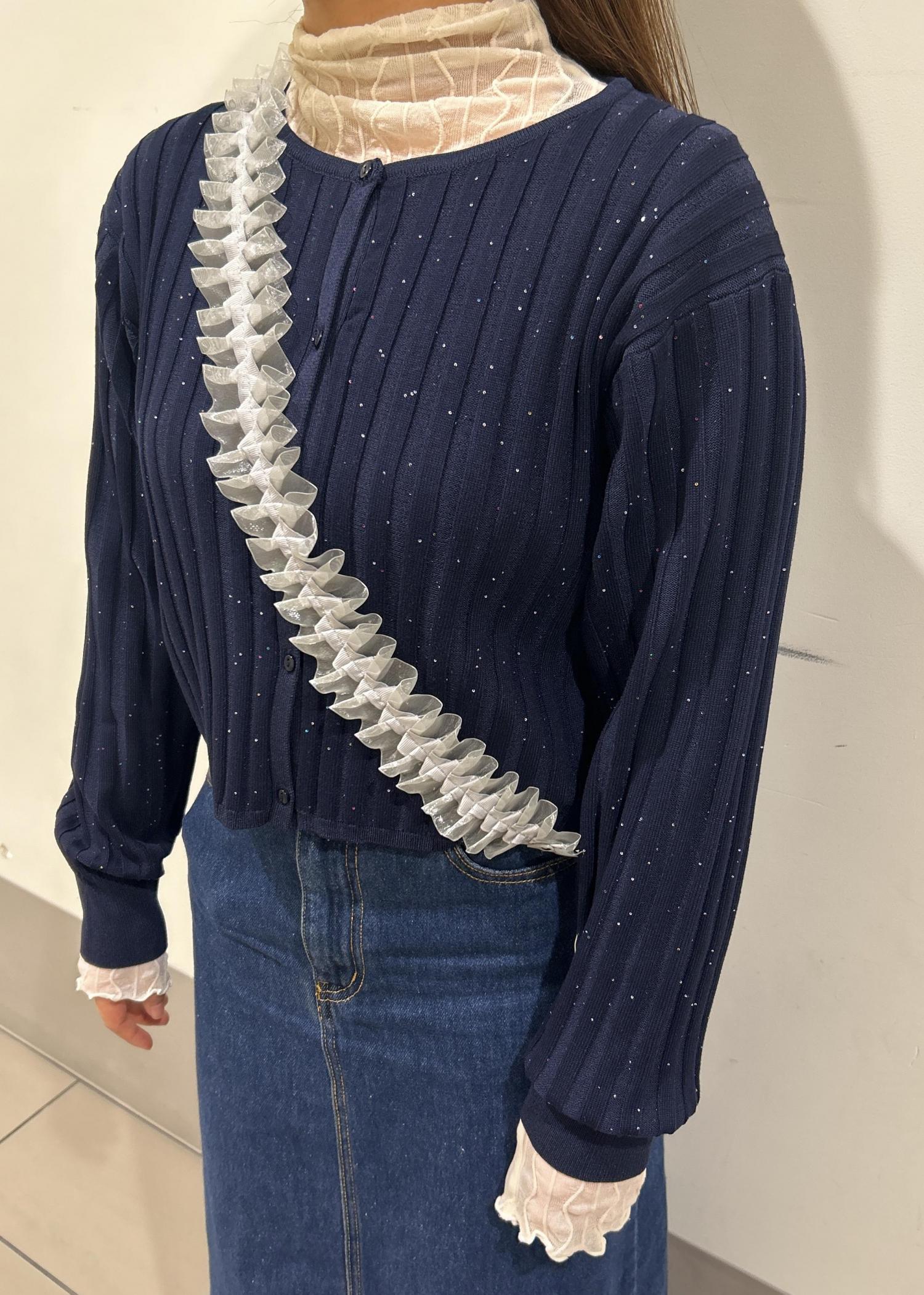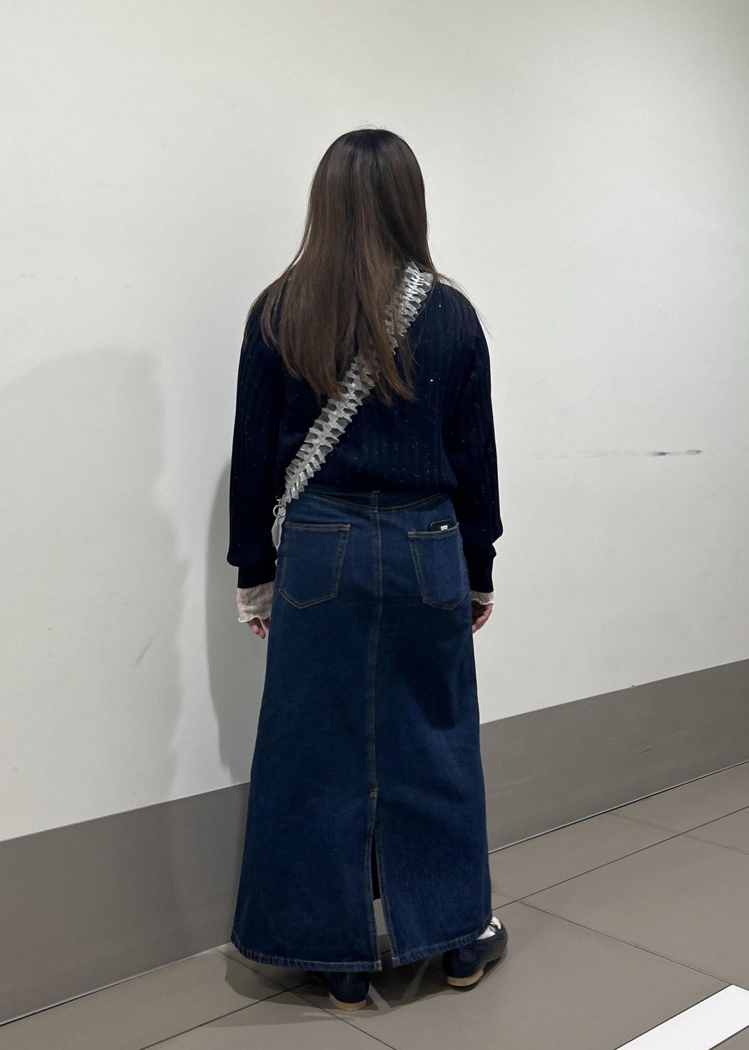 Aラインのデニムスカートとラメ感のかわいいカーディガンでカジュアルなコーデにしました。カジュアルなデニムスカートにローファー合わせがポイントです◉