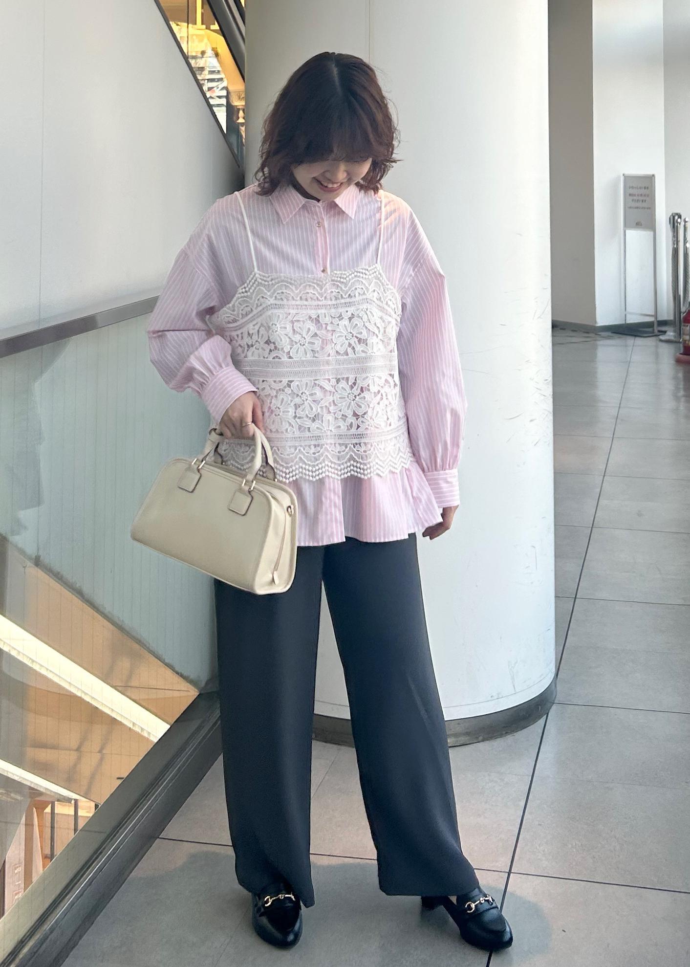 モノトーンでまとめていますがカーディガンのディテールやリボンのデザインが可愛らしく、春らしさも少しプラスしてくれます。全体的に軽やかに見えるよう、シルバーのバッグもワンポイント。