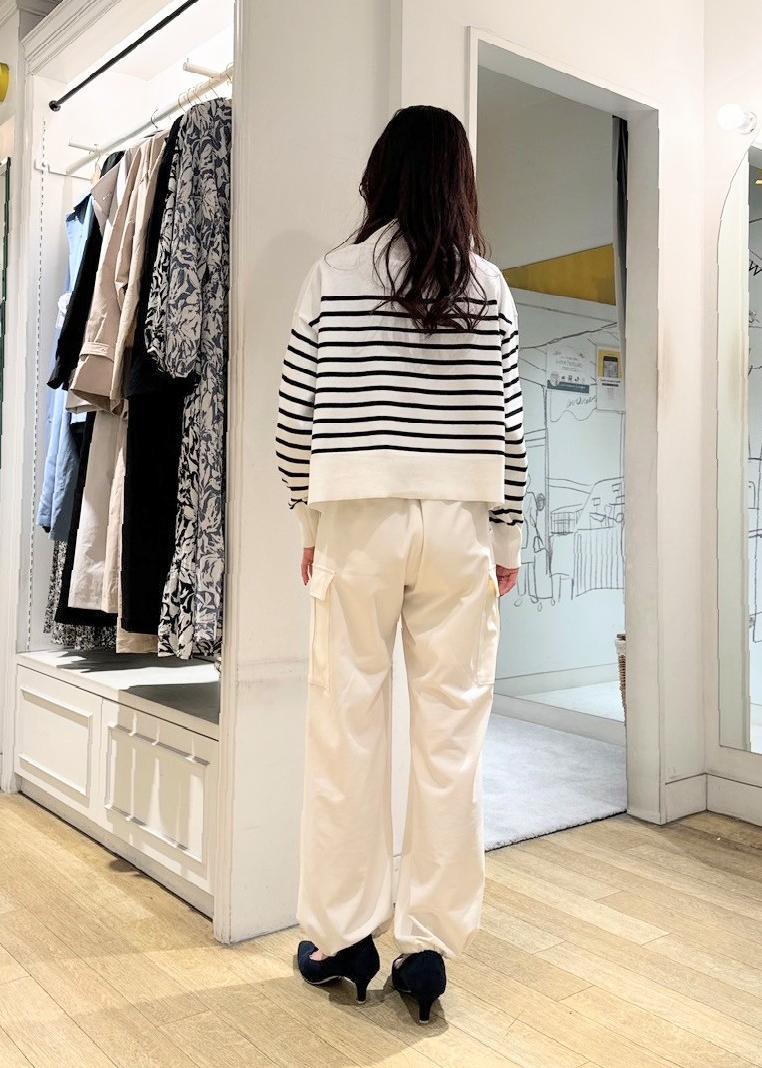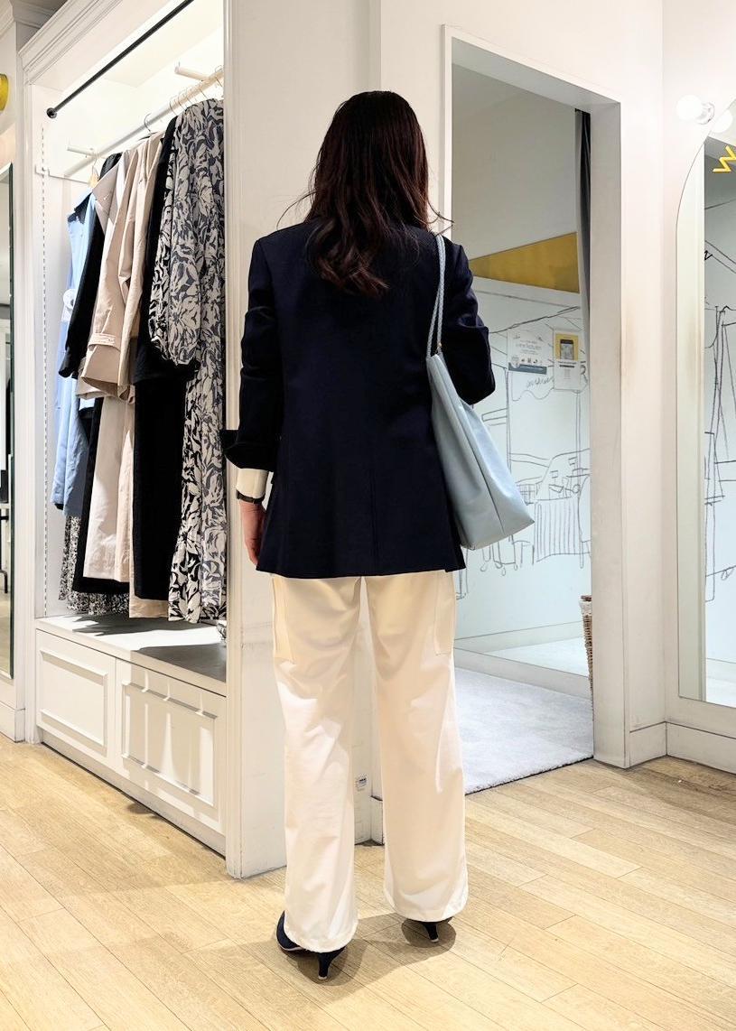 トレンドのカーゴパンツに、ネイビーの金ボタンジャケットを羽織った、きれいめカジュアルコーデ!