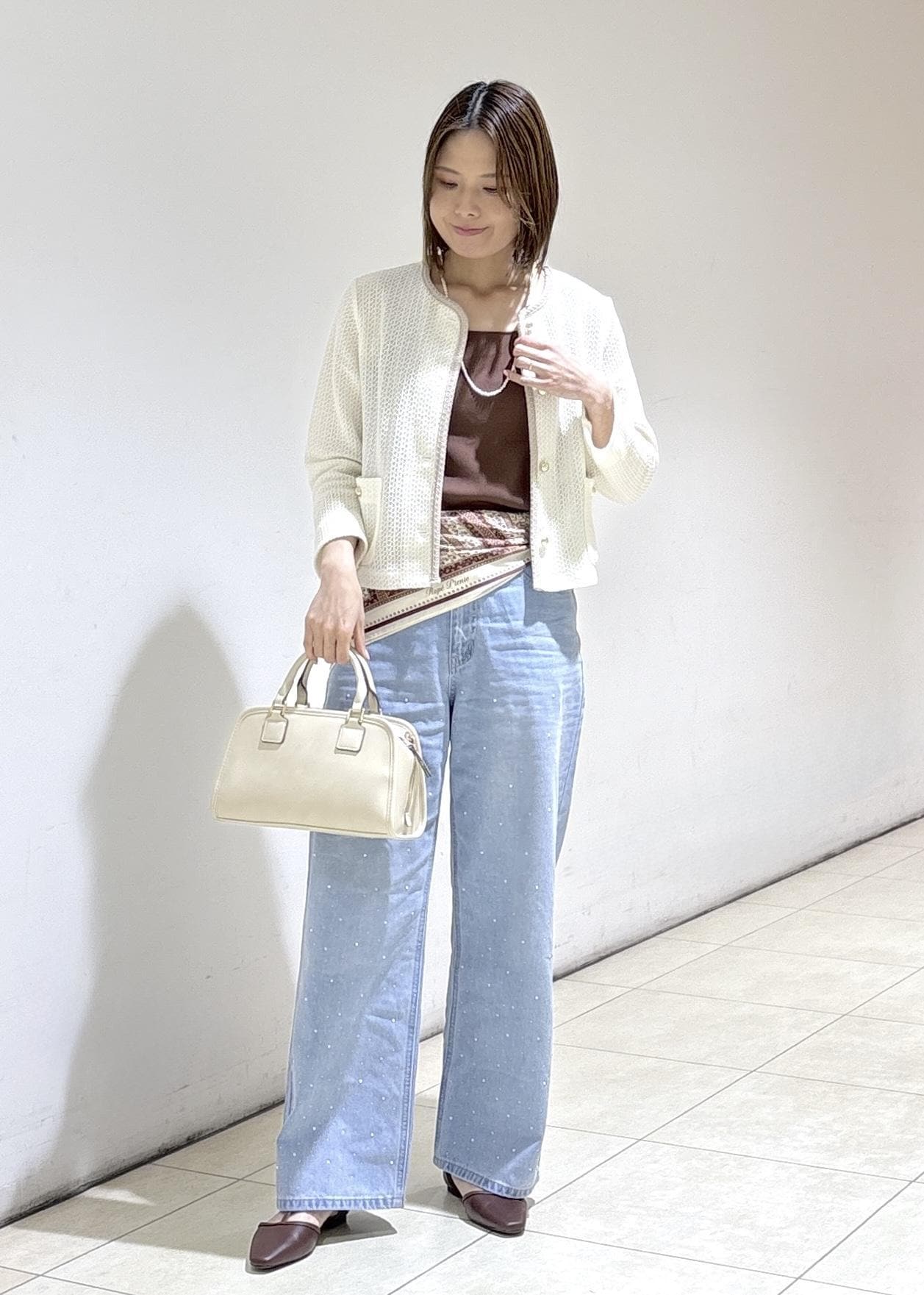 ボーダーのカーディガンときれいめなワイドパンツで合わせきれいめカジュアルにまとめました。