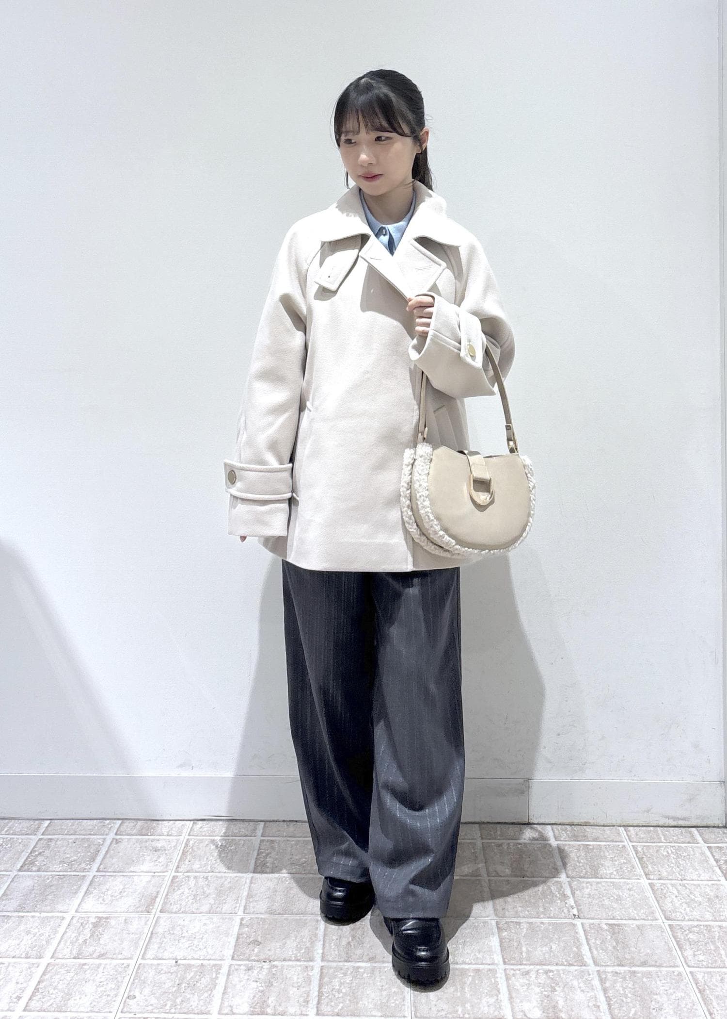 パンツスタイルのオフィスコーデです◎ボリュームのあるトップスはハイウエストパンツにインすると良いです♪