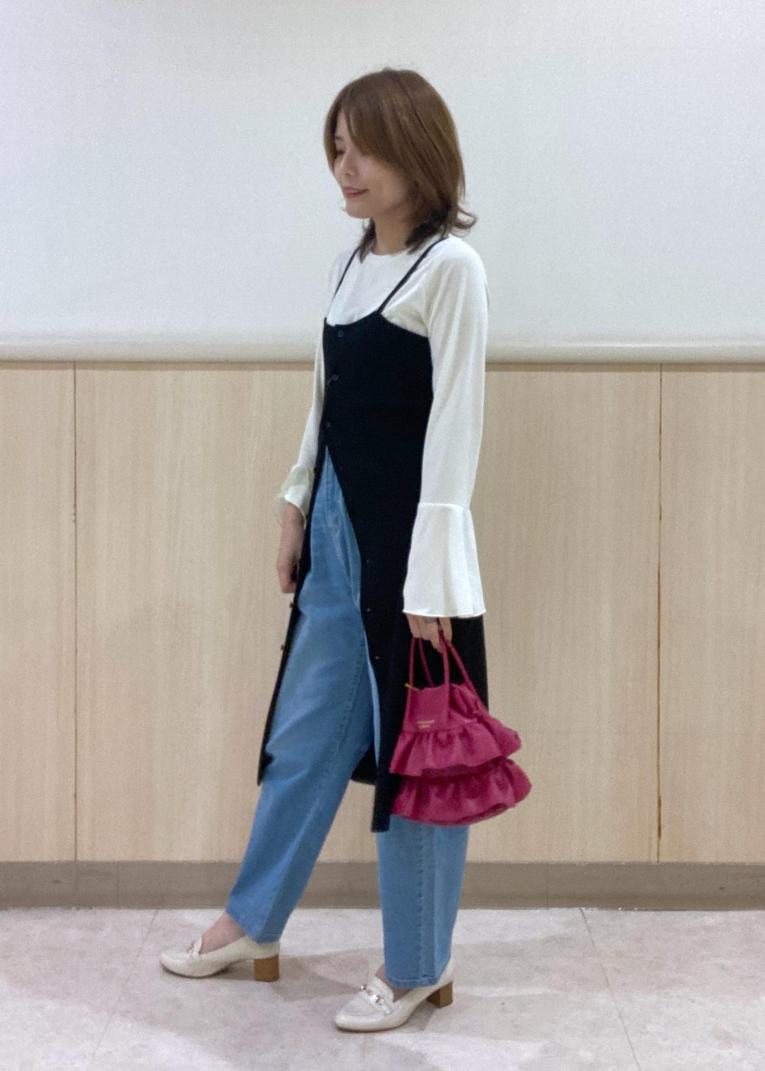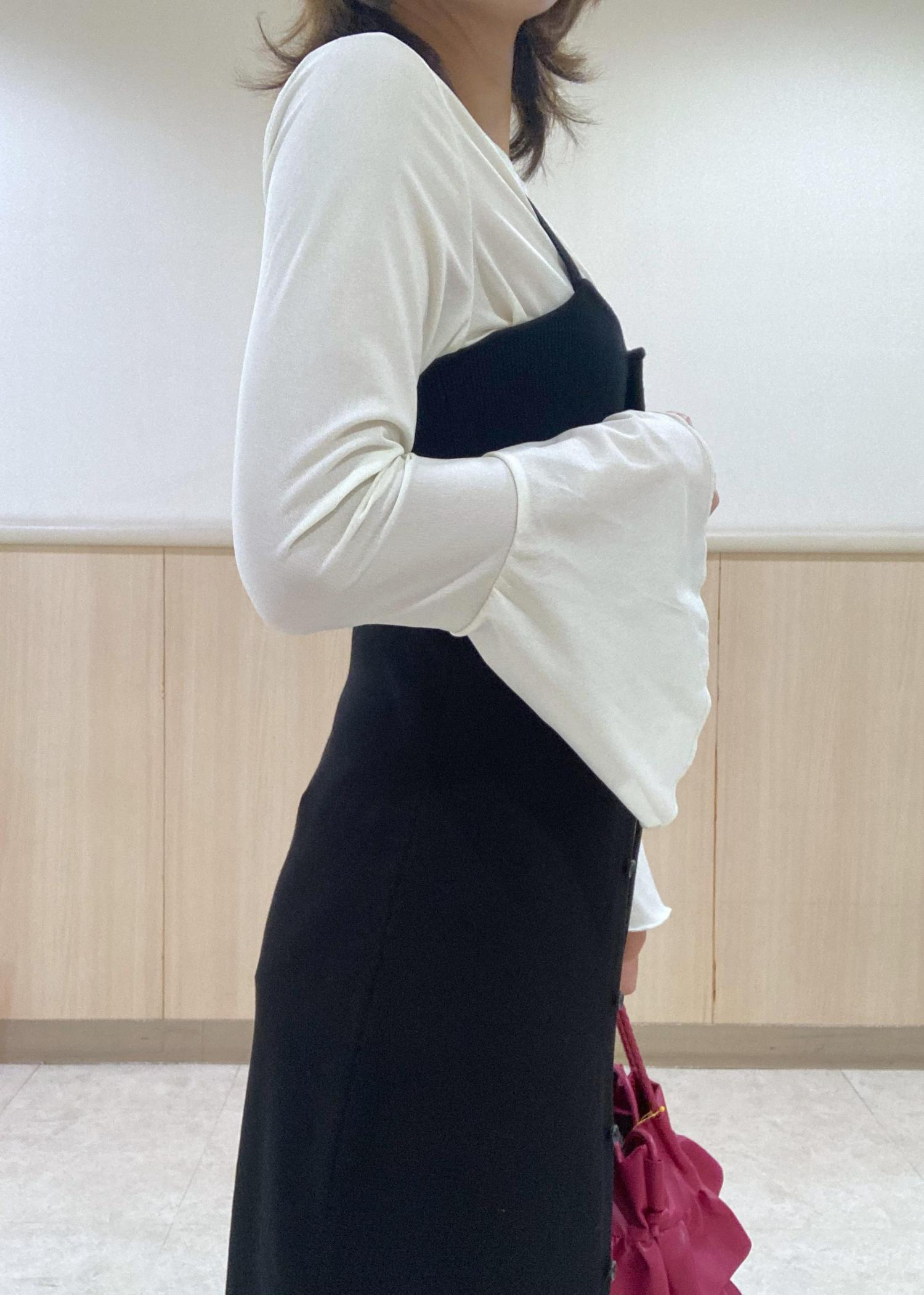 38サイズ(丈感長め)着用で膝丈くらいの丈感です!伸縮性はありますが、細身のデザインなので身体のラインは拾います!ボタンを全部閉めてミニワンピ風に着ても、肩紐を外しても着用できるので着回し力抜群です◎ -