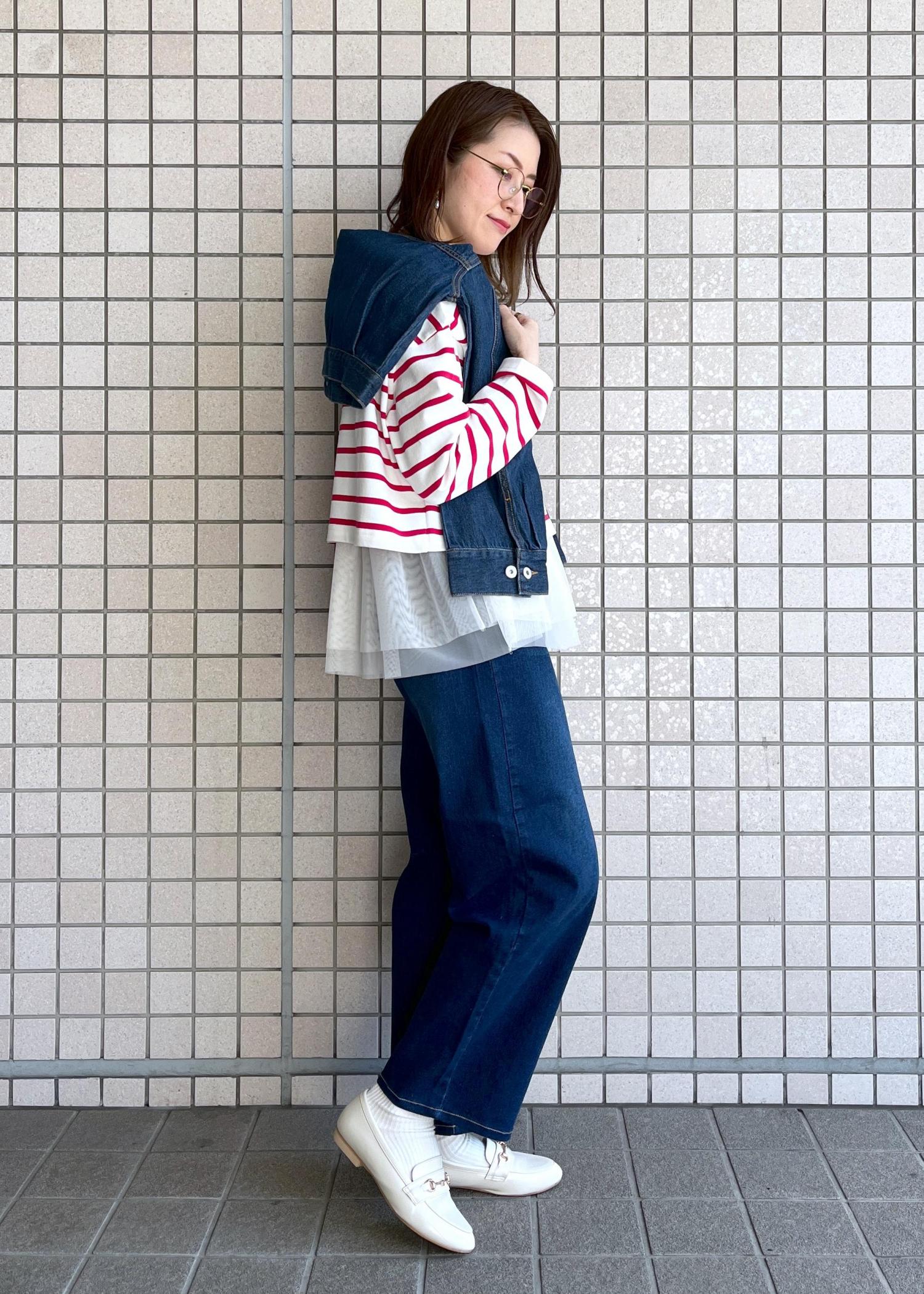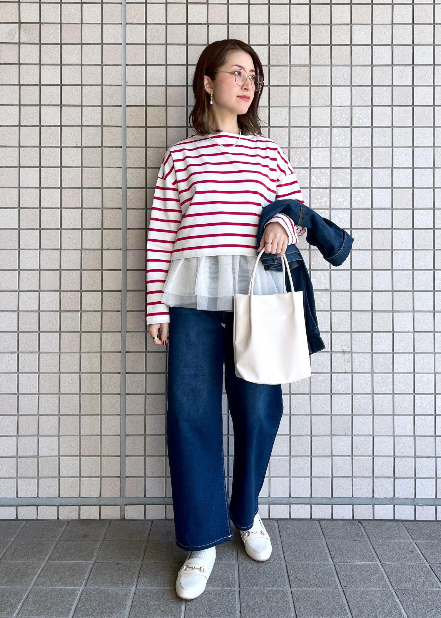 赤ボーダーカットソーとデニムのカジュアルコーデ