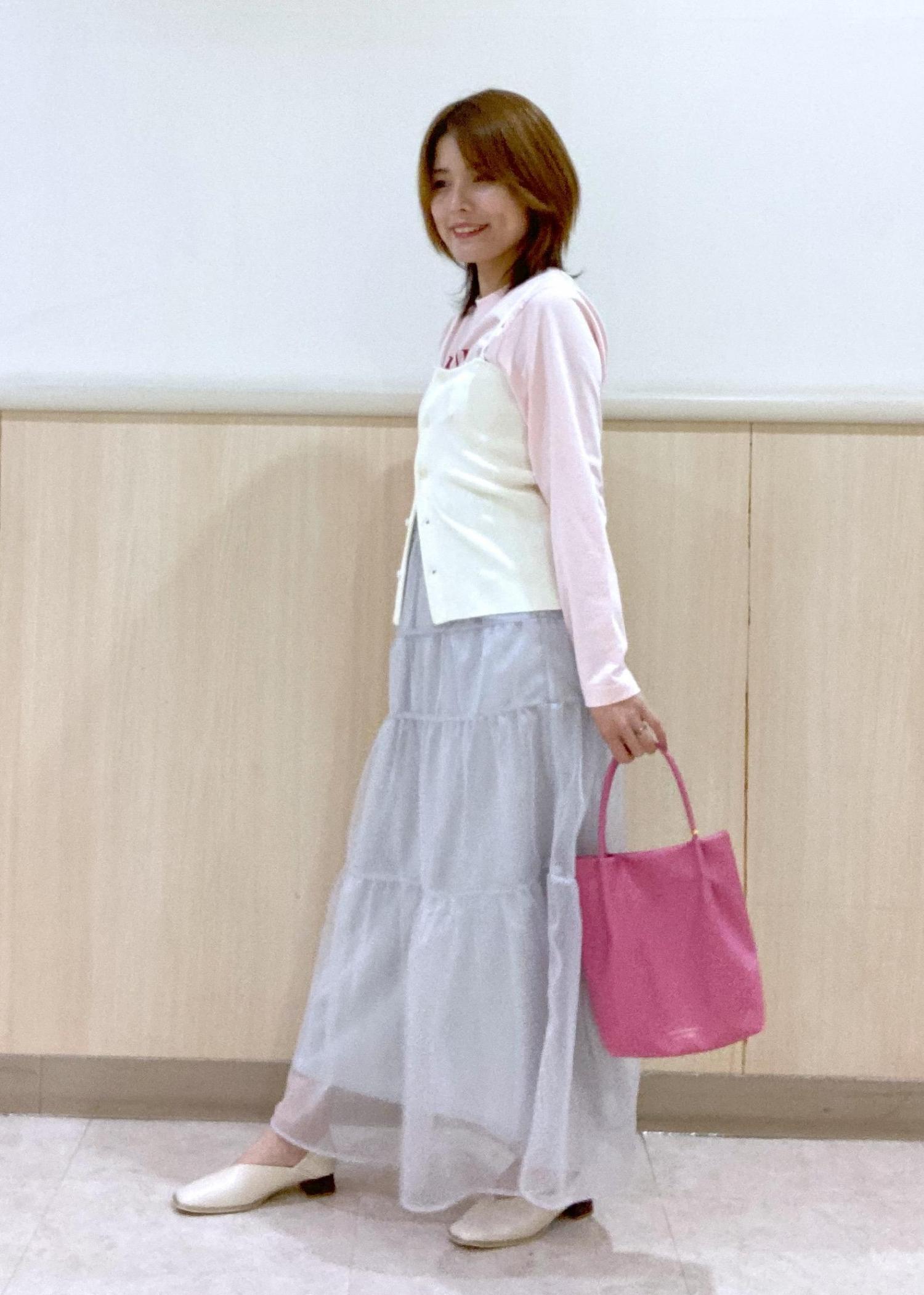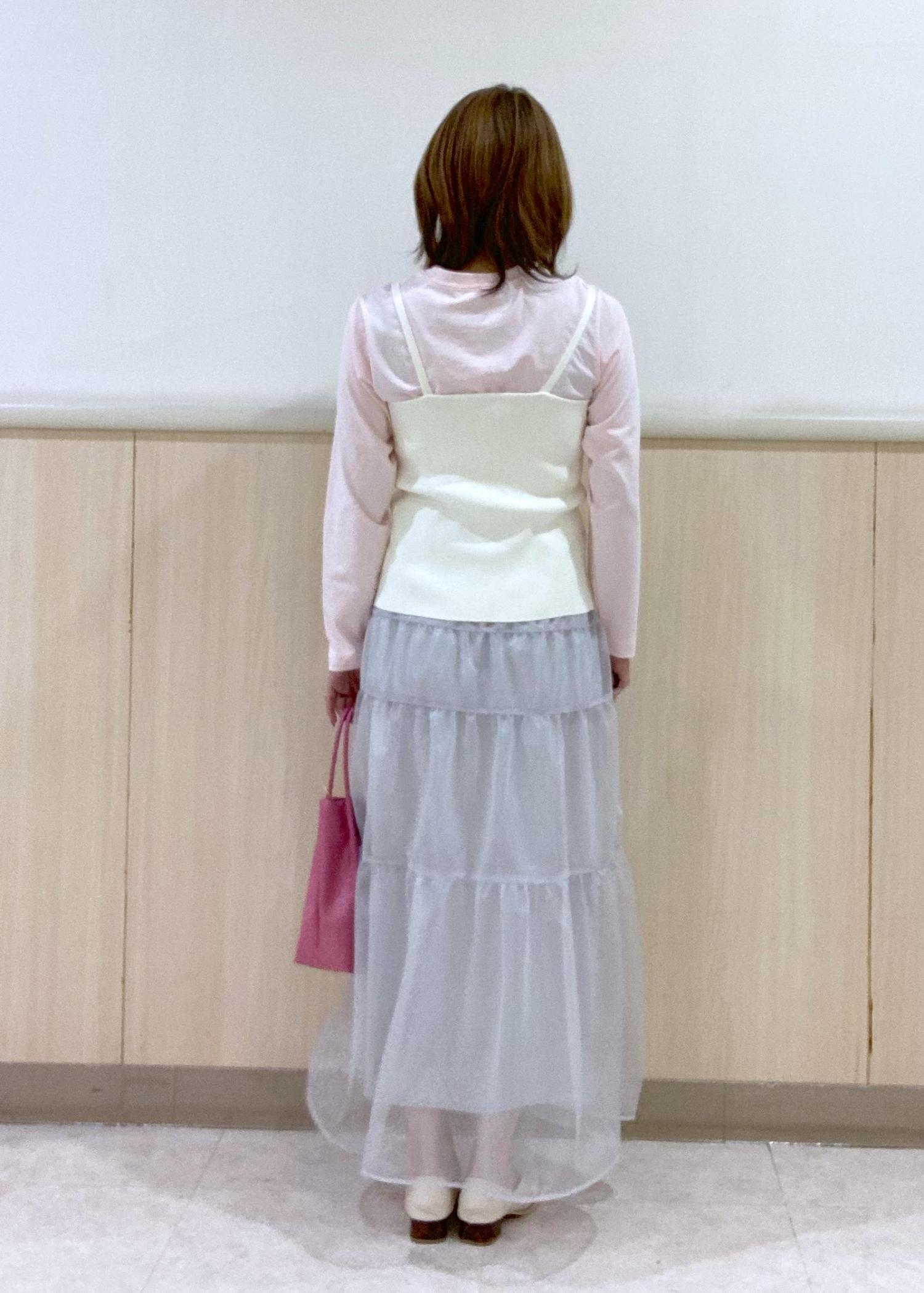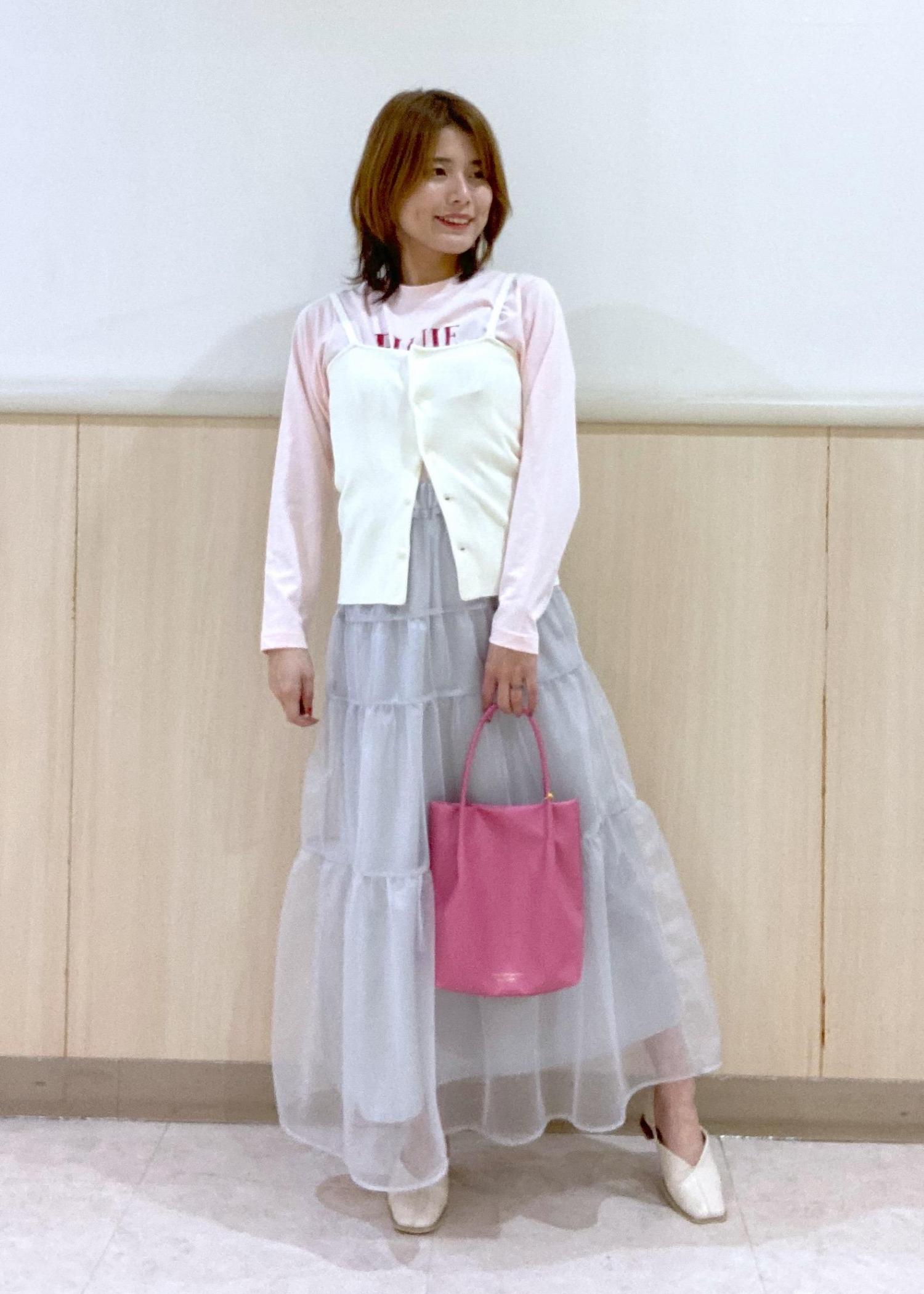 ビスチェのボタンを下からふたつ開けて、ウエスト位置を高くみせるとふわっとしたスカート合わせでもスタイルアップ効果が狙えます♩