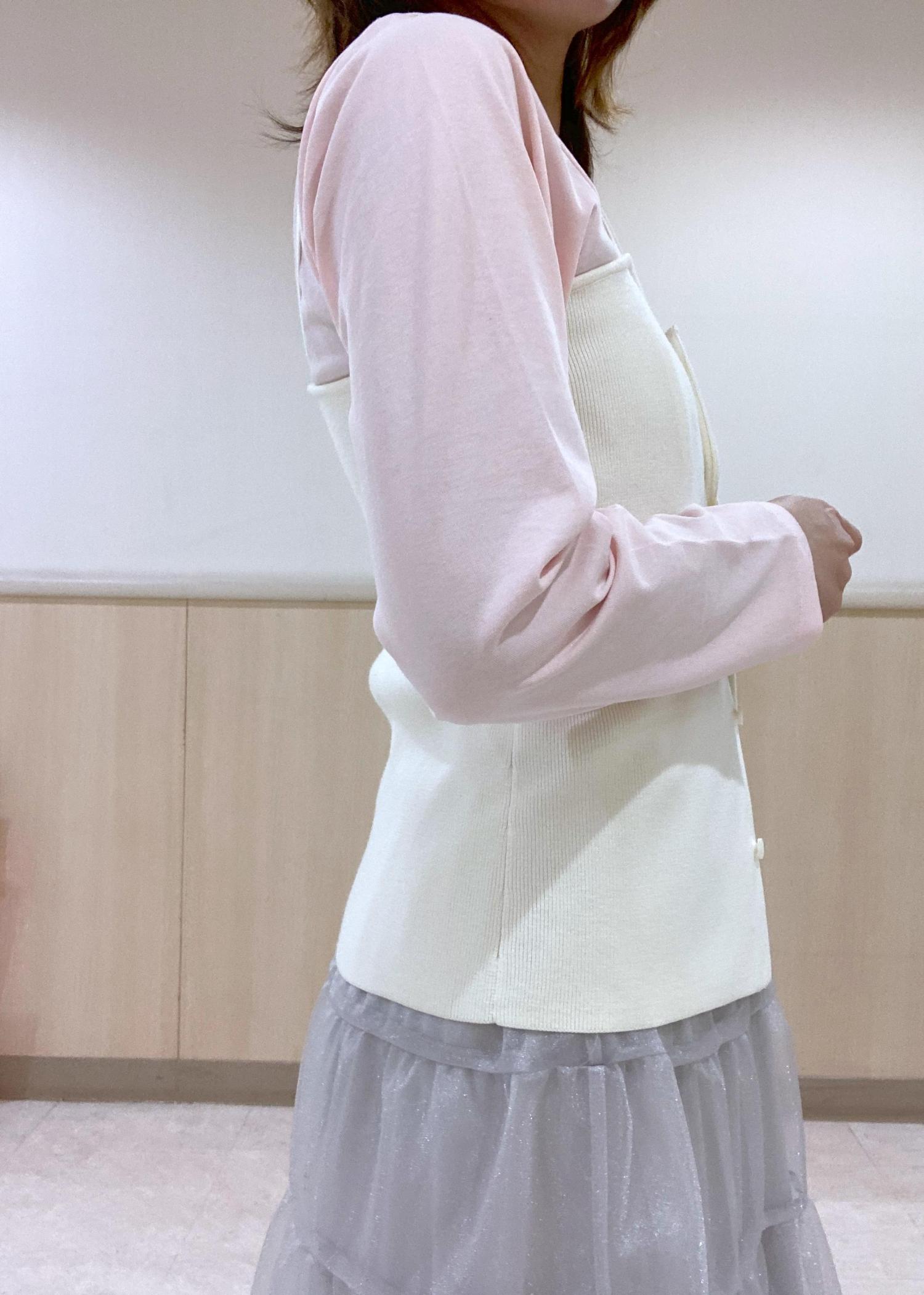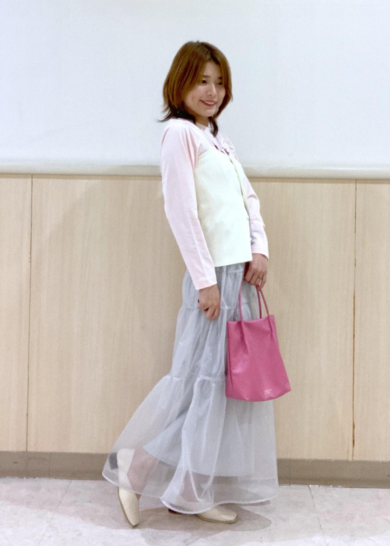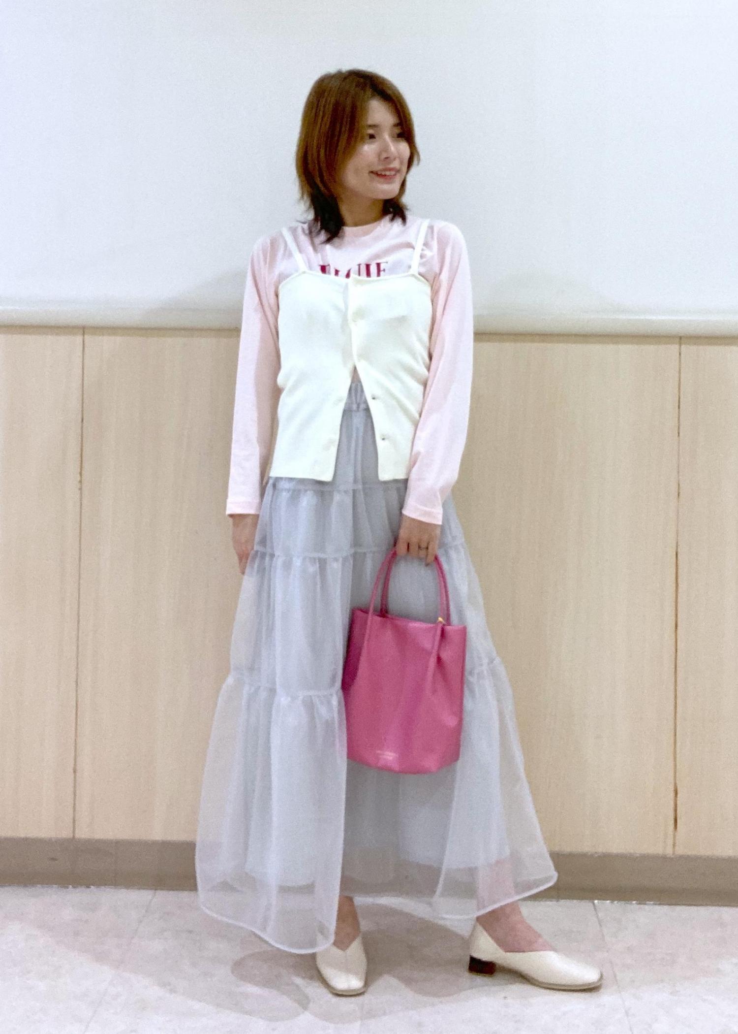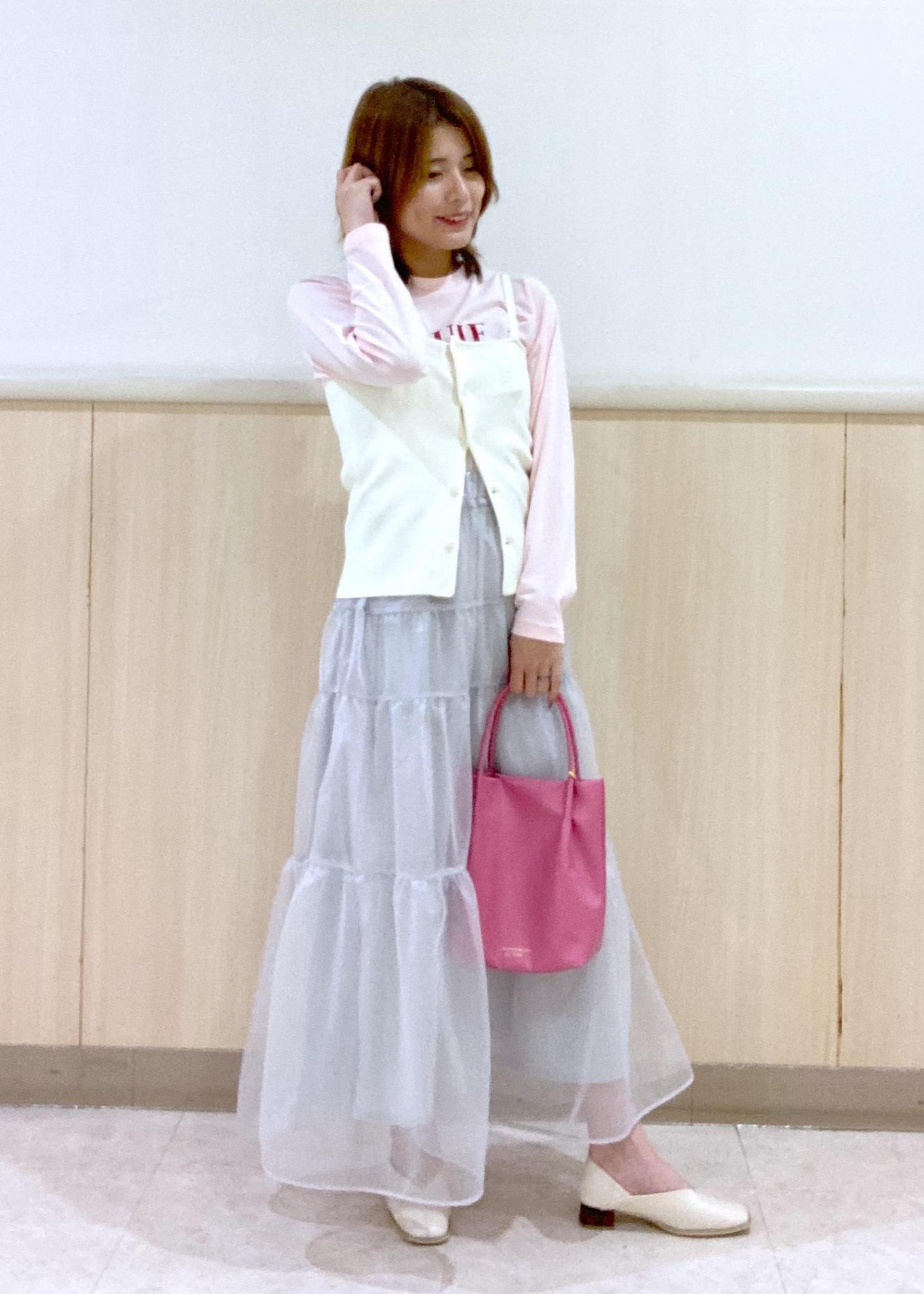 ビスチェのボタンを下からふたつ開けて、ウエスト位置を高くみせるとふわっとしたスカート合わせでもスタイルアップ効果が狙えます♩