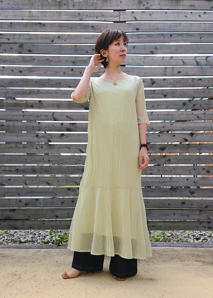 やや薄手の素材なので、下着は肌に近いベージュ系か、デニムレイヤードもおすすめ。