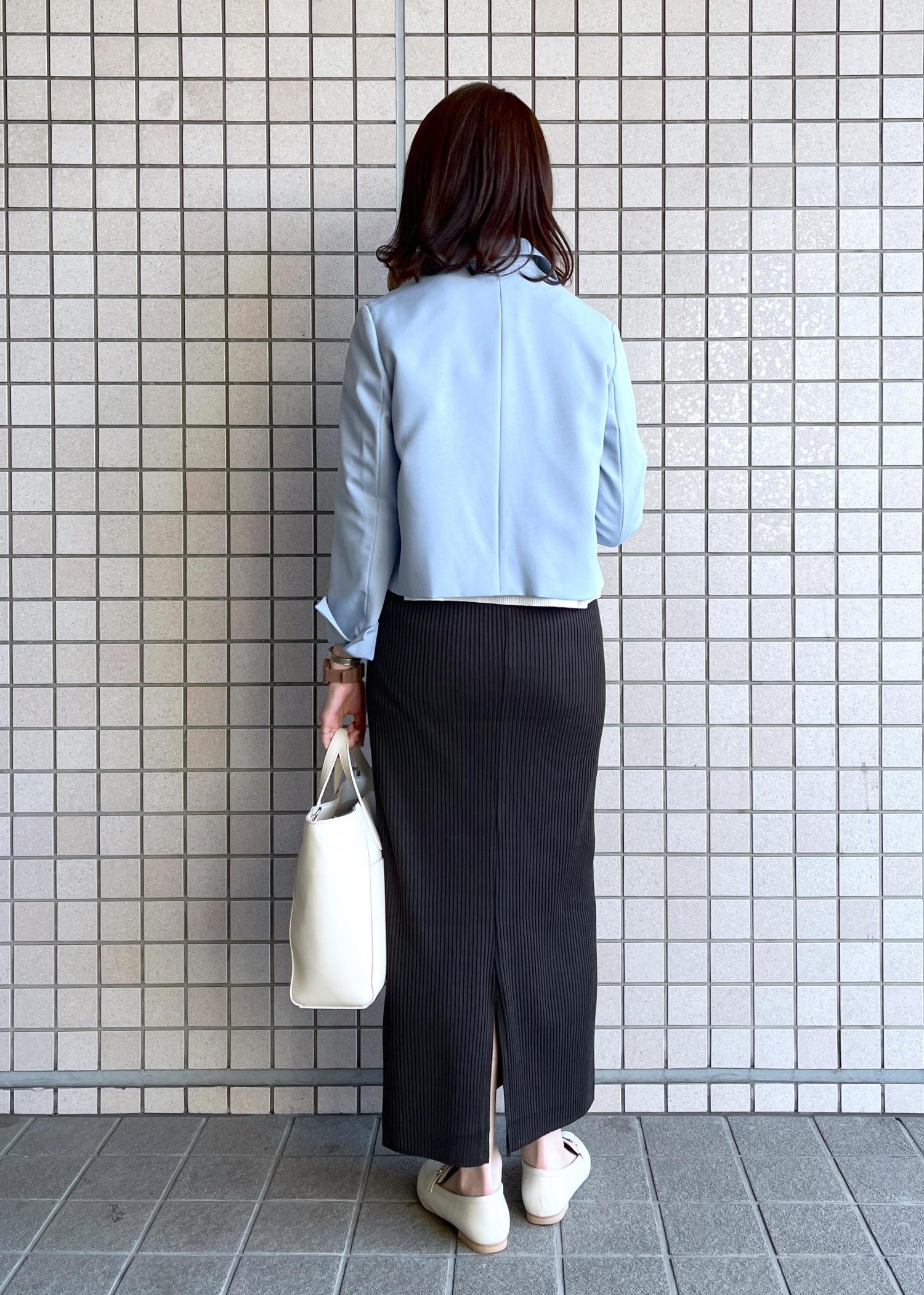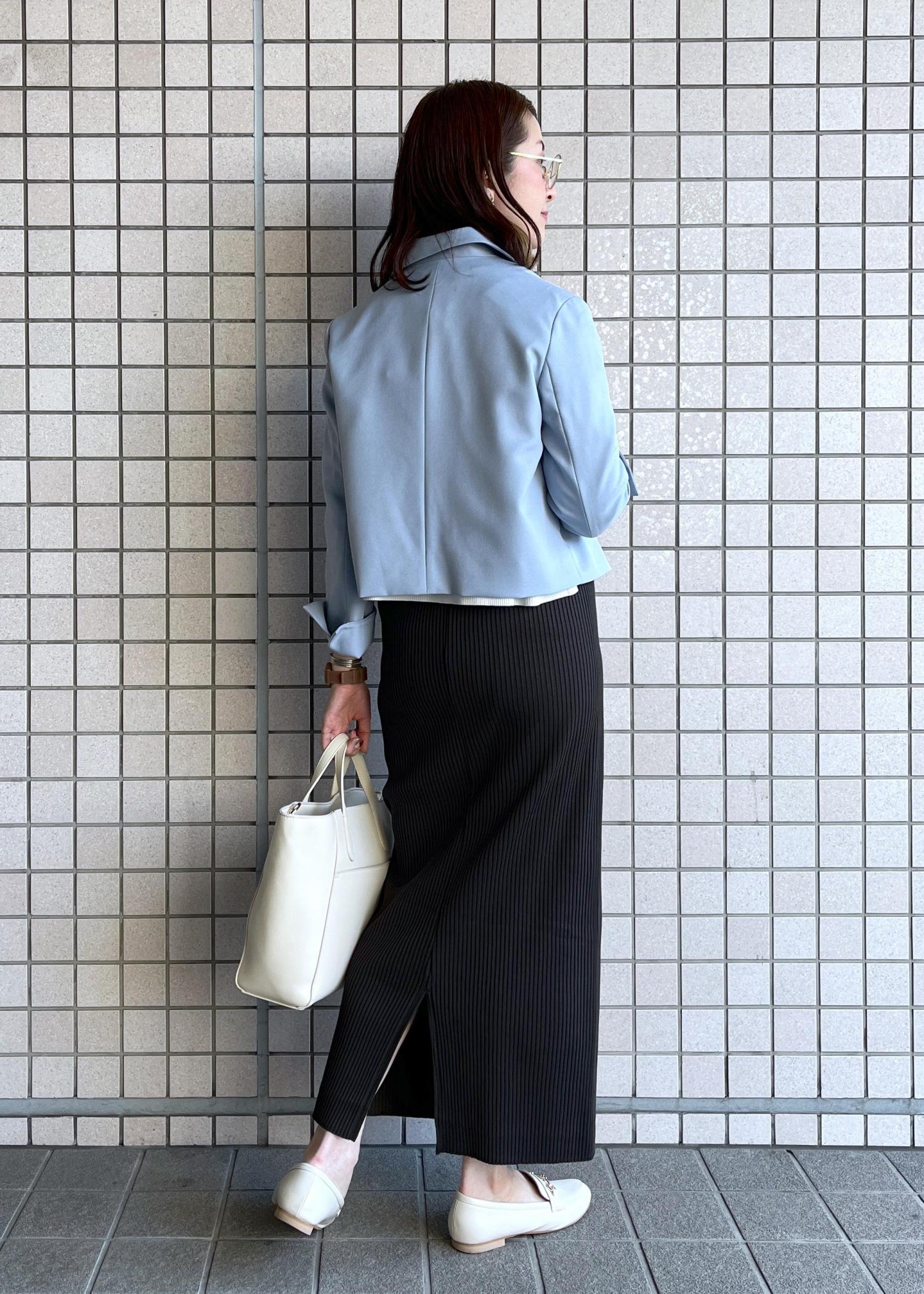 サックスブルーが爽やかな印象のジャケットを主役の、シンプルなコーディネートです。