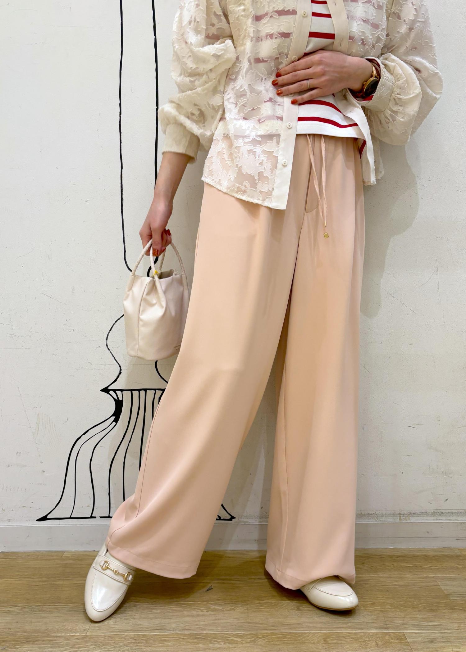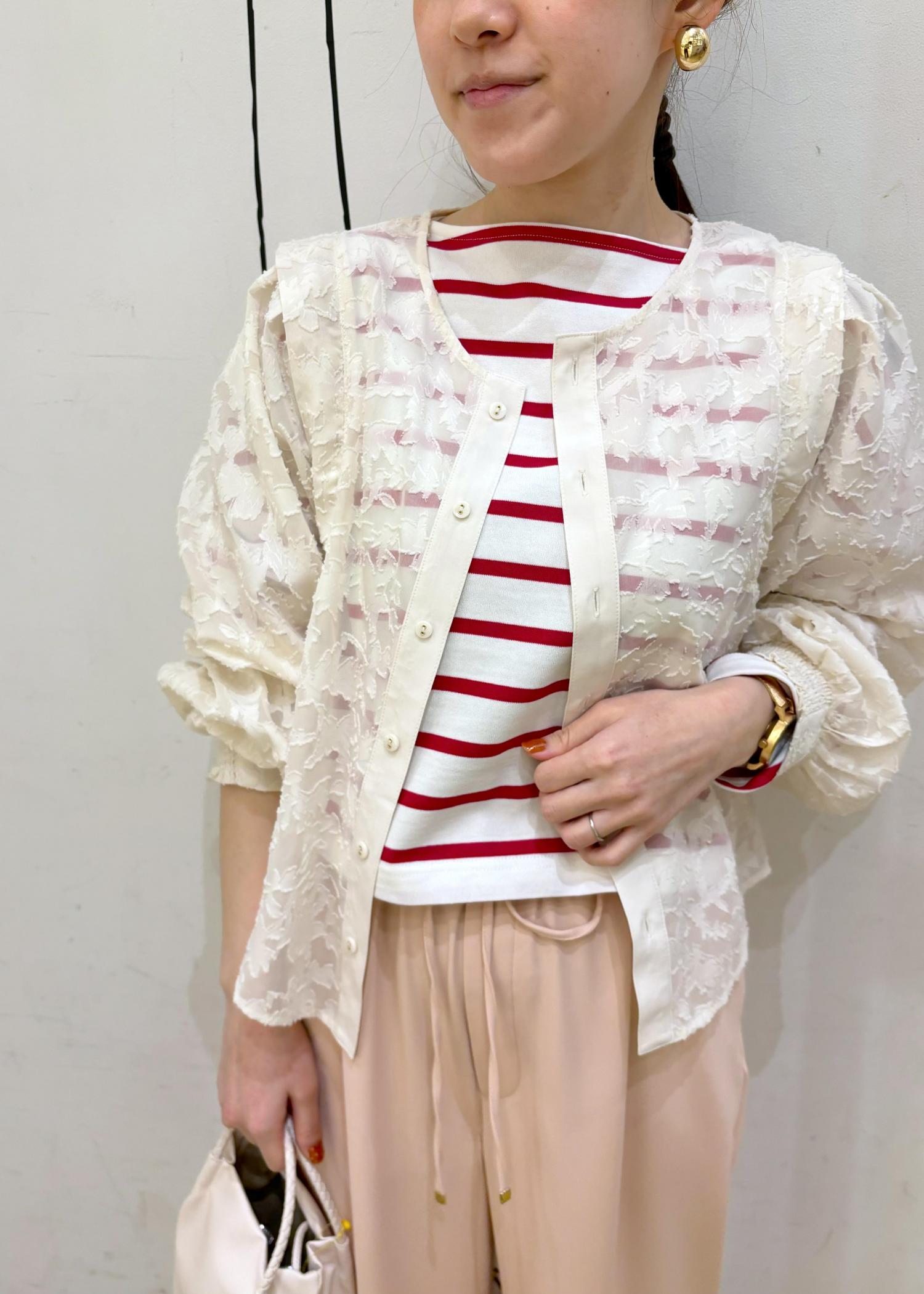 赤ボーダー×ピンクパンツのカラーコーデ。シアー感のあるジャガードカーディガンを羽織ってより春らしい雰囲気に。