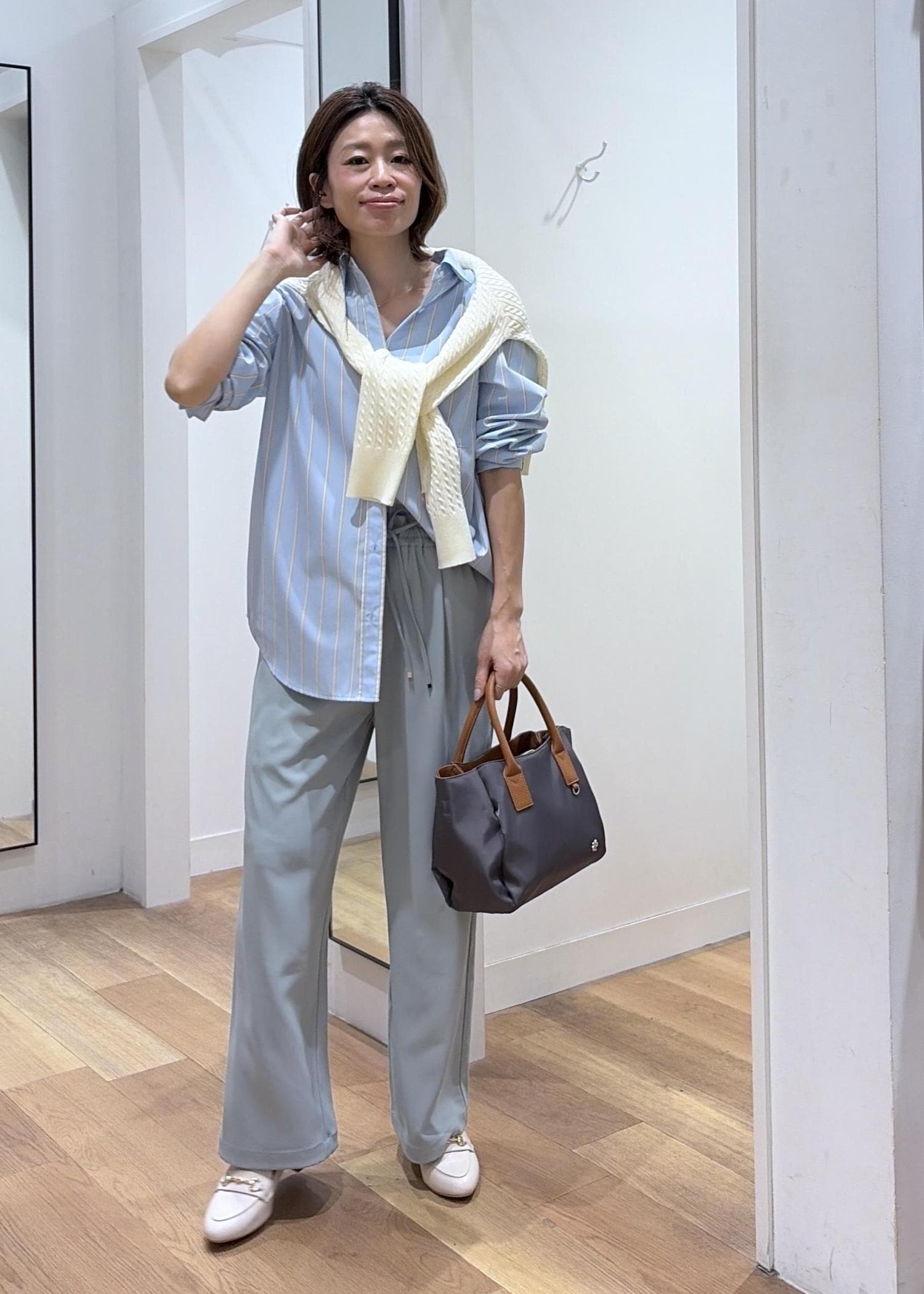 シャイニースカート合わせで大人カジュアルスタイルに。