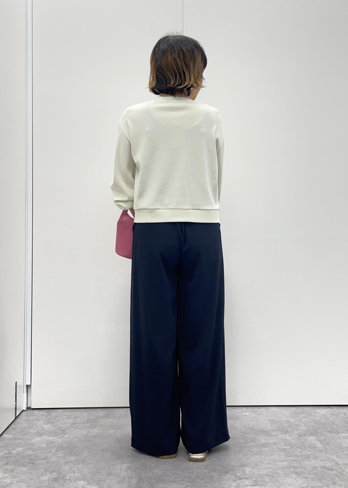 キナリのカーデに、ネイビーのパンツを合わせたシンプルコーデ。
