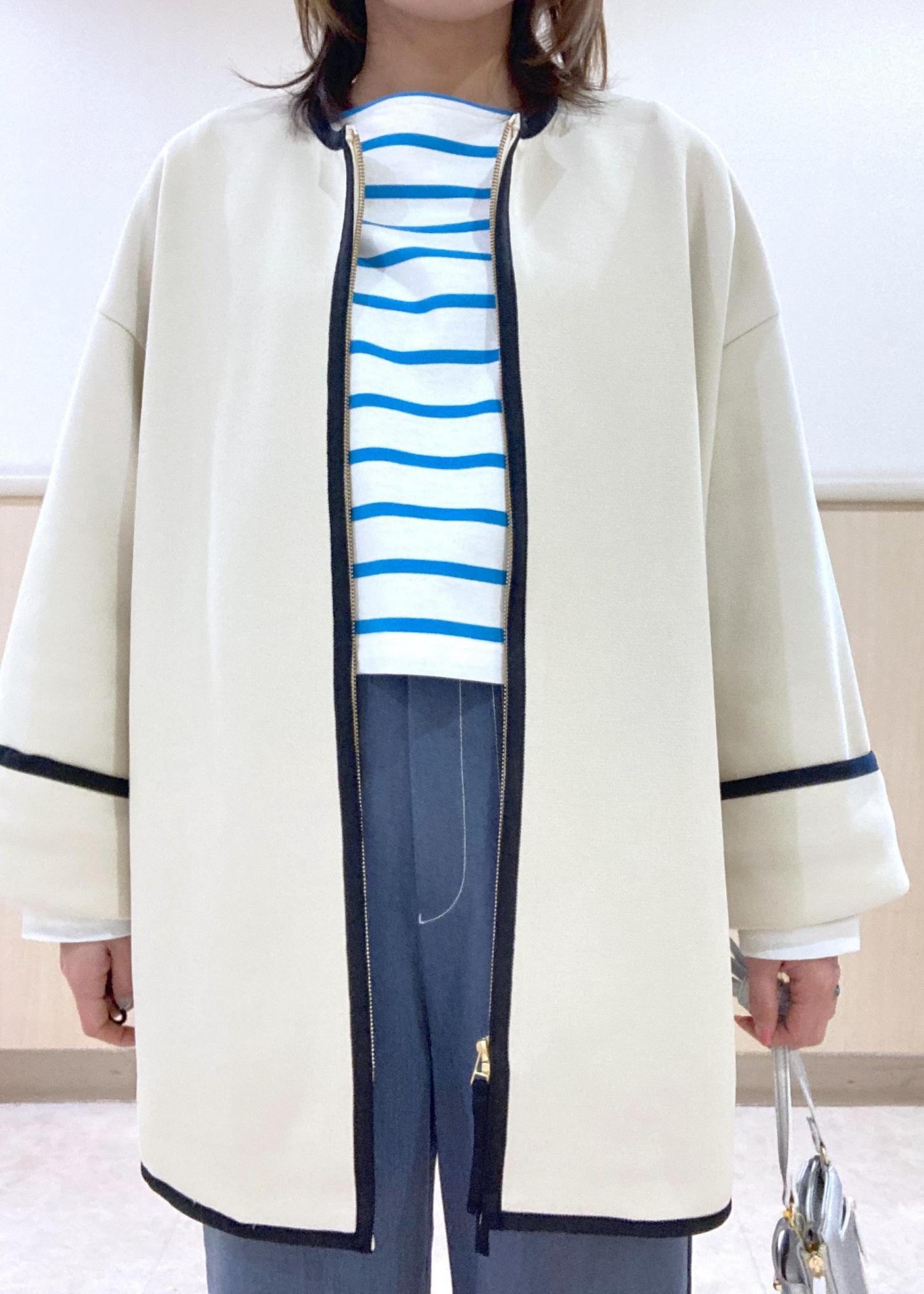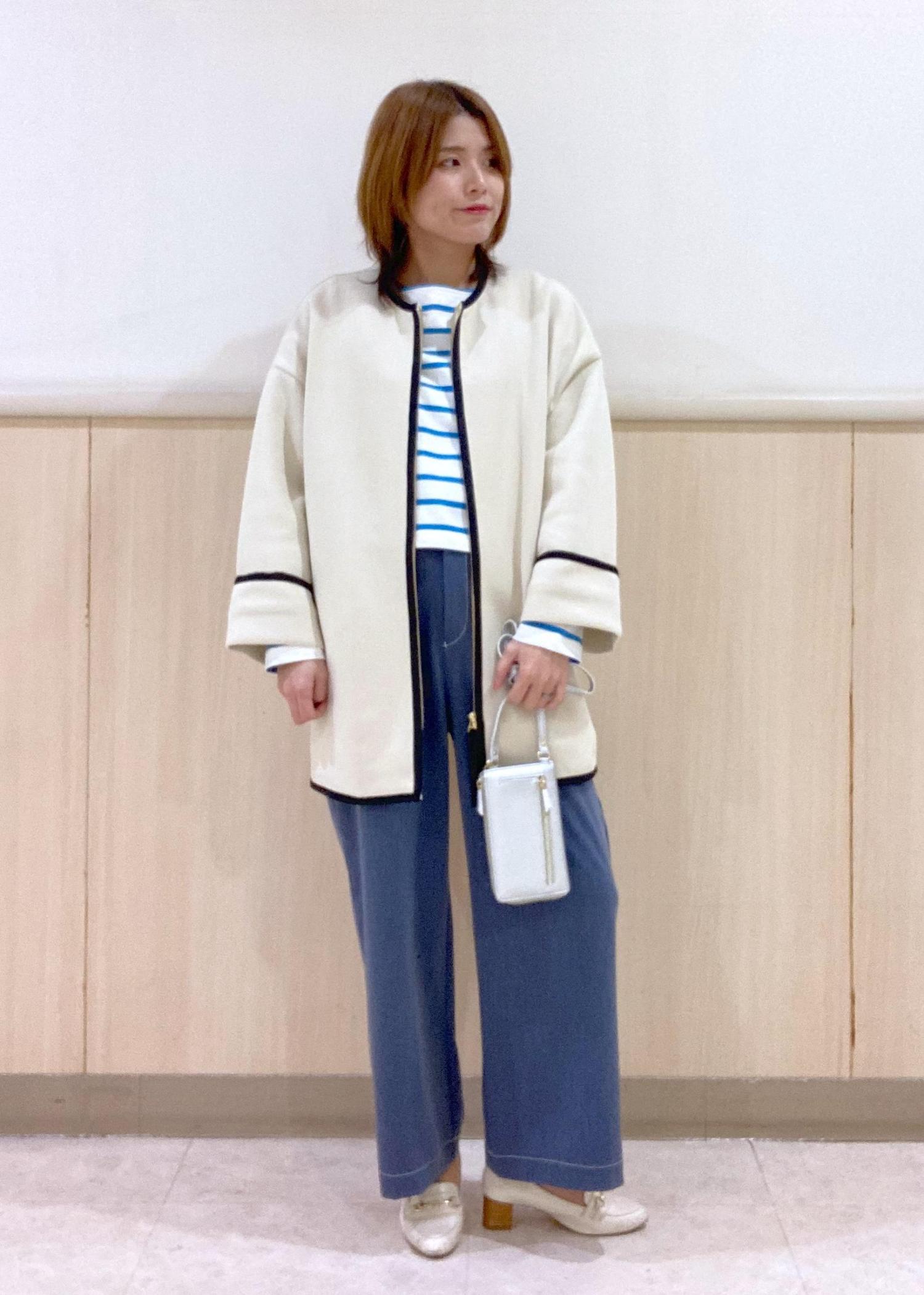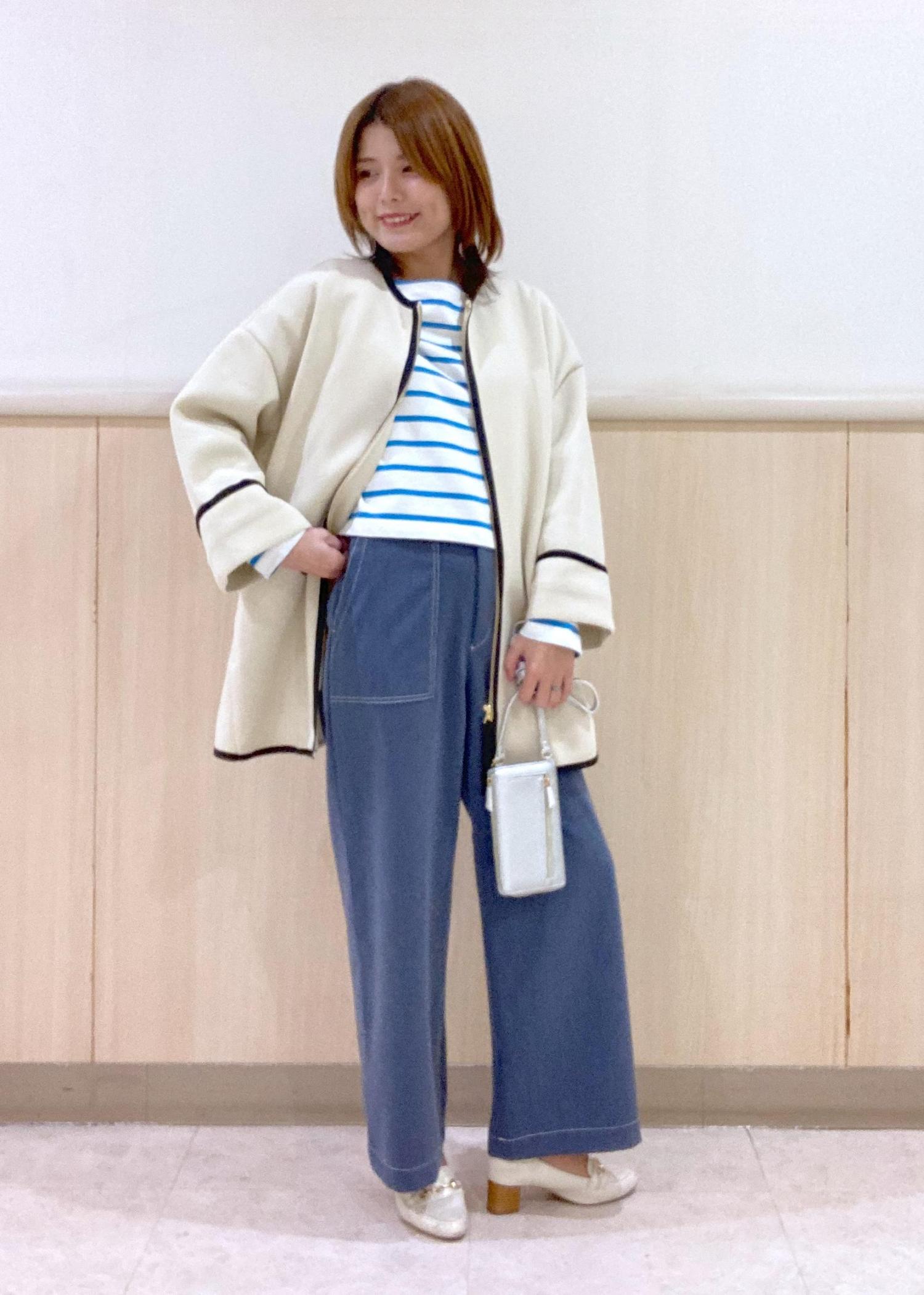 ショート丈のボーダートップス×ベイカーパンツのカジュアルなコーデに、ゆったりサイズなのに綺麗みえするライトアウターを羽織った大人っぽい綺麗めカジュアルコーデ!