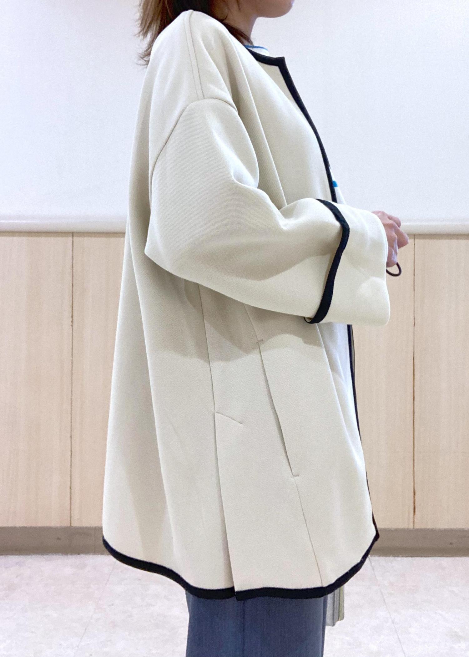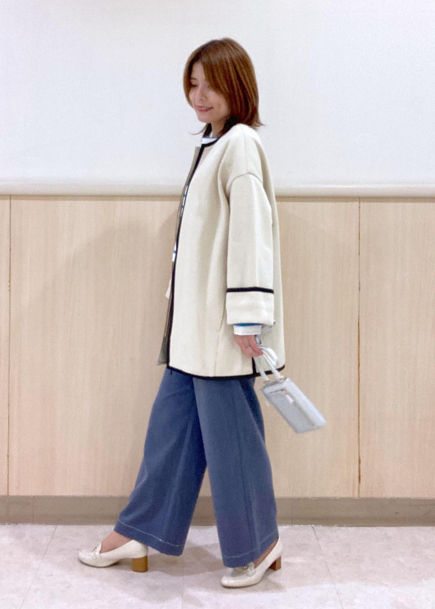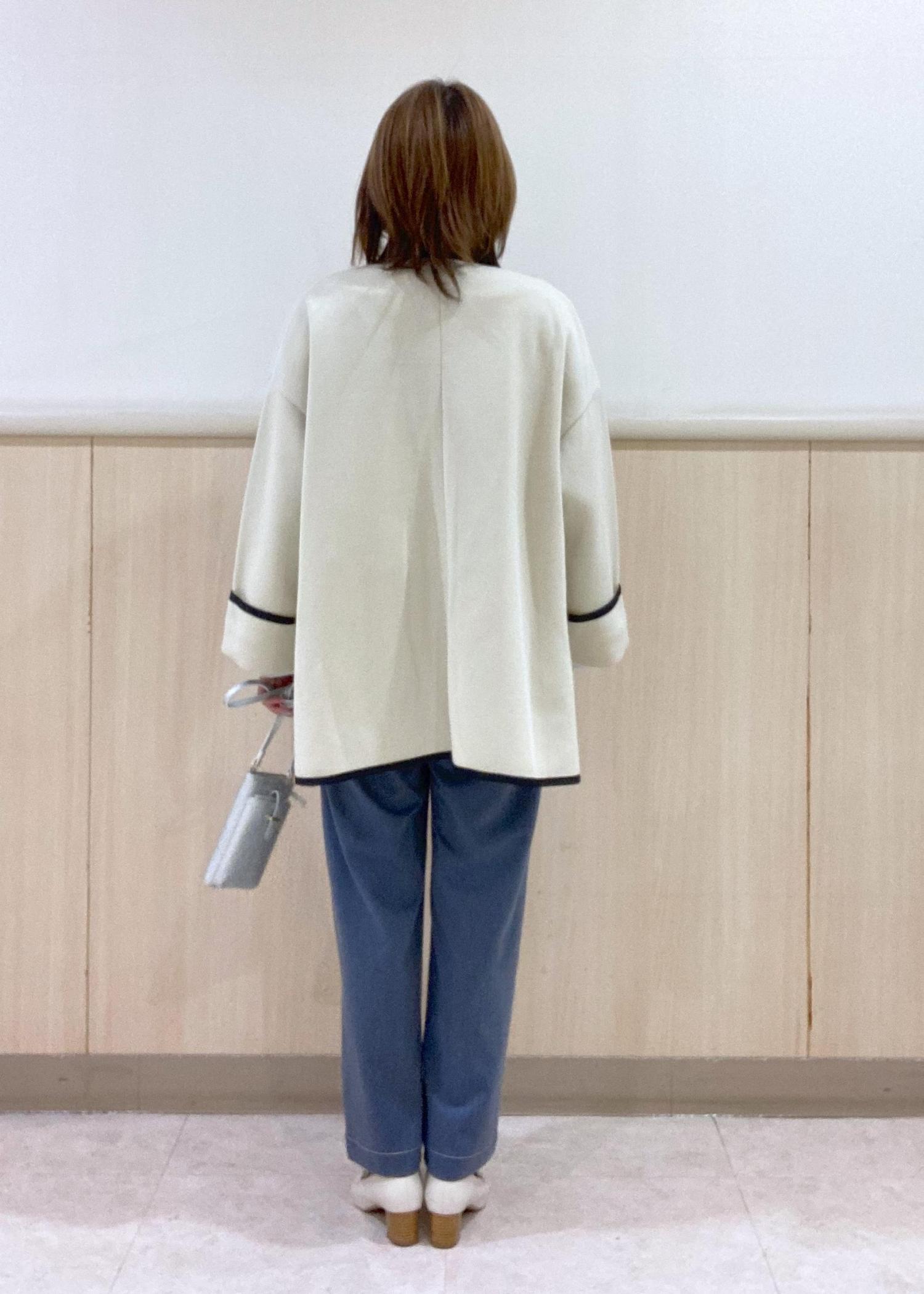 ショート丈のボーダートップス×ベイカーパンツのカジュアルなコーデに、ゆったりサイズなのに綺麗みえするライトアウターを羽織った大人っぽい綺麗めカジュアルコーデ!