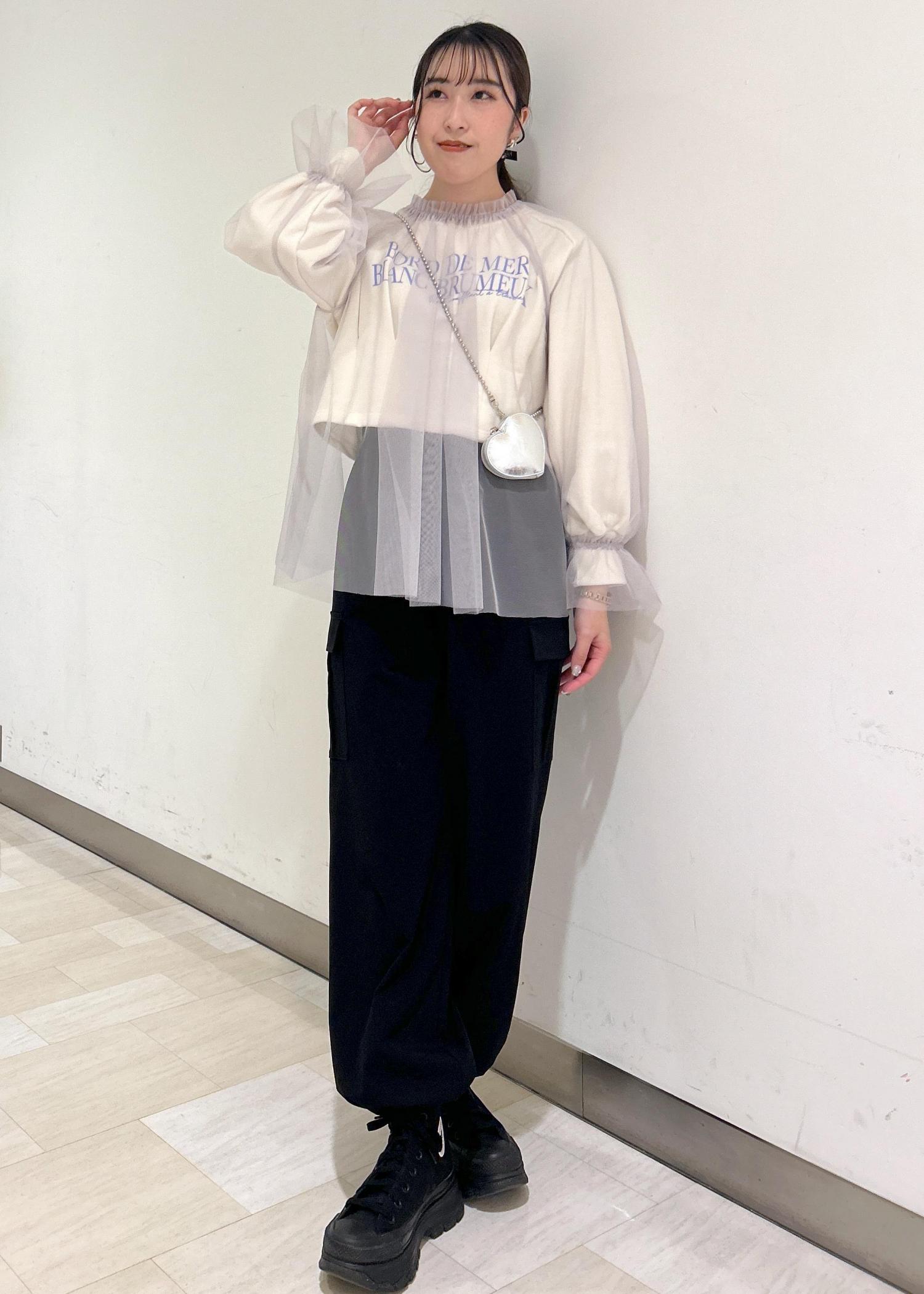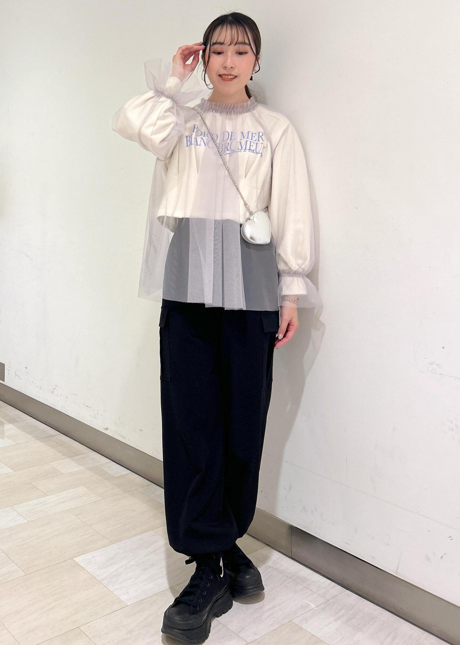 スウェット1枚で着るのが苦手なので、上からチュールを重ねて、チラッとスウェットを見せた着方をしました。
