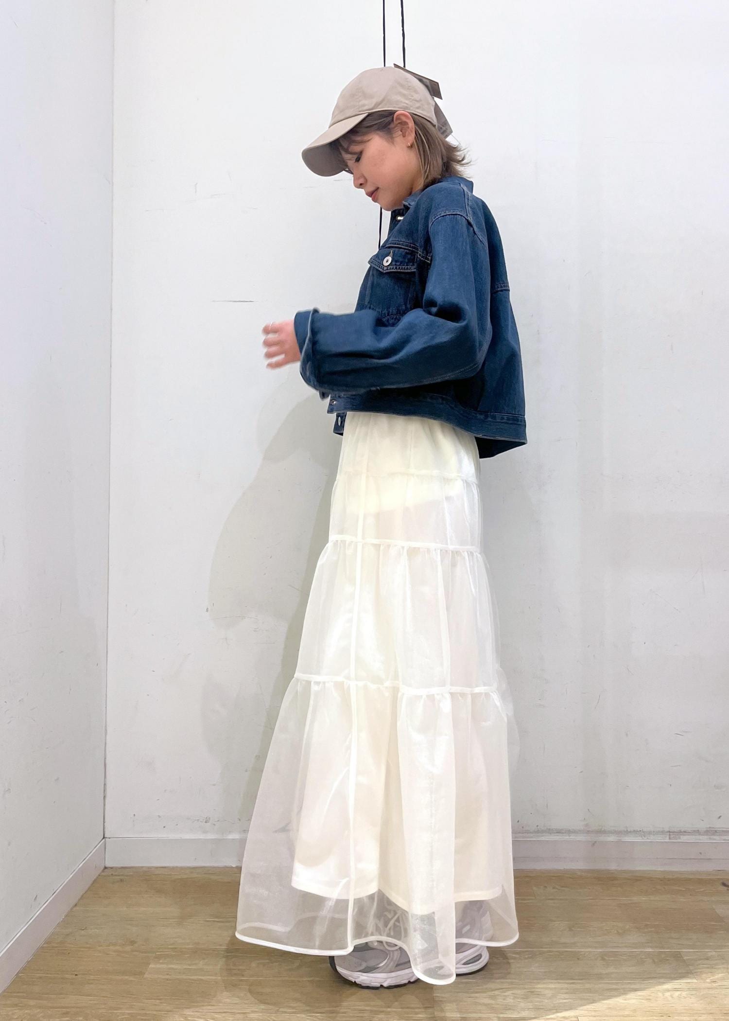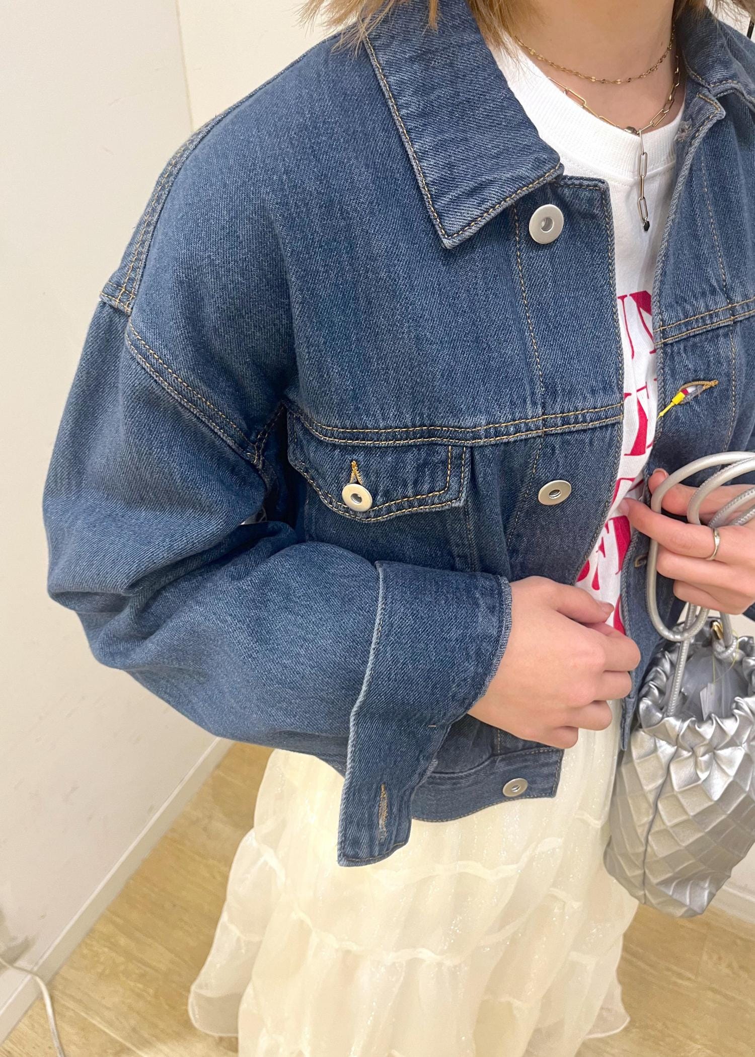 デニムジャケットでカジュアルなコーデを組みました! 短い丈感なのでスカートなどと合わせるとスタイルアップになっておすすめです!