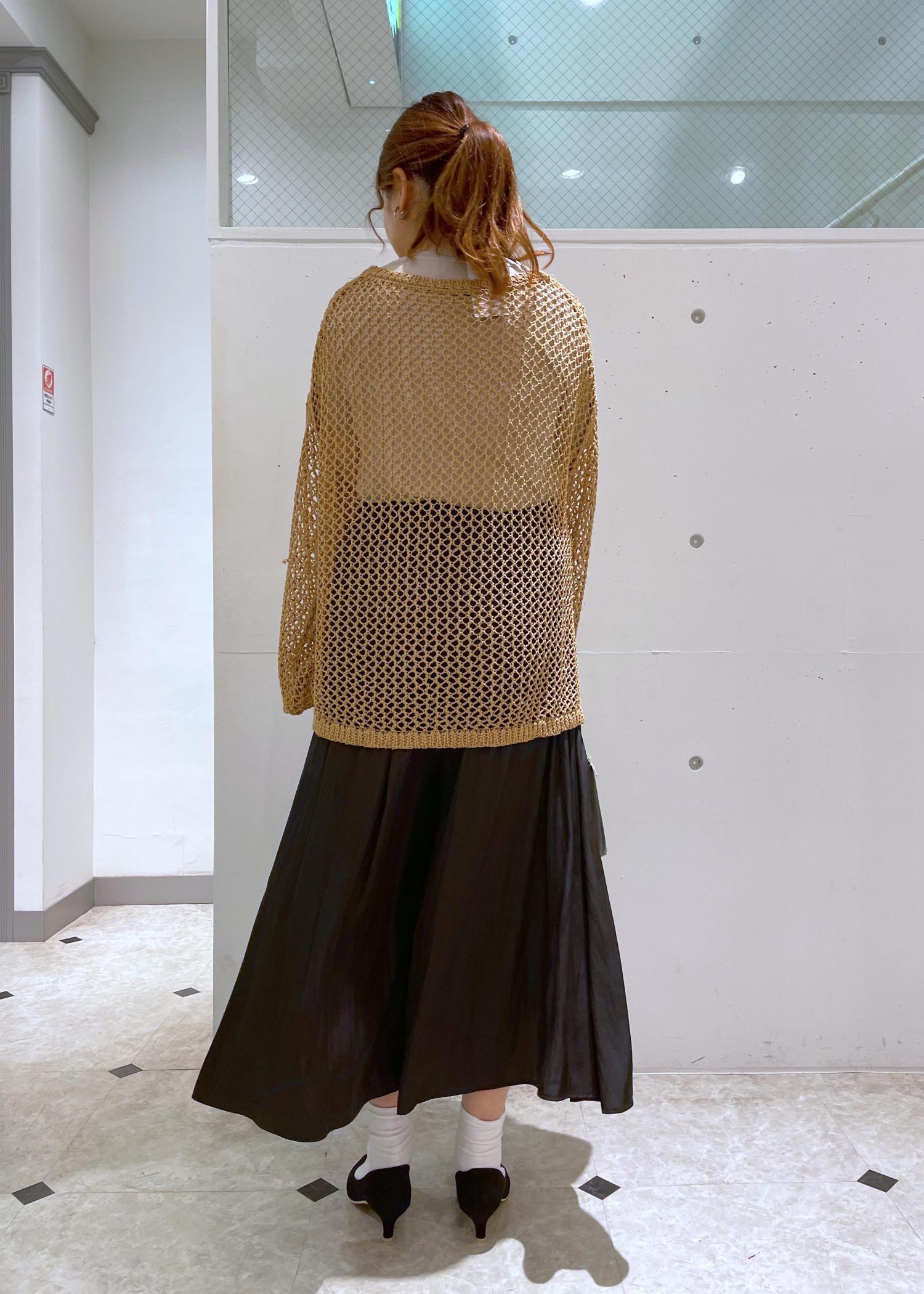 春らしい透かし編みトップスをメインにした綺麗めお出かけコーデです。