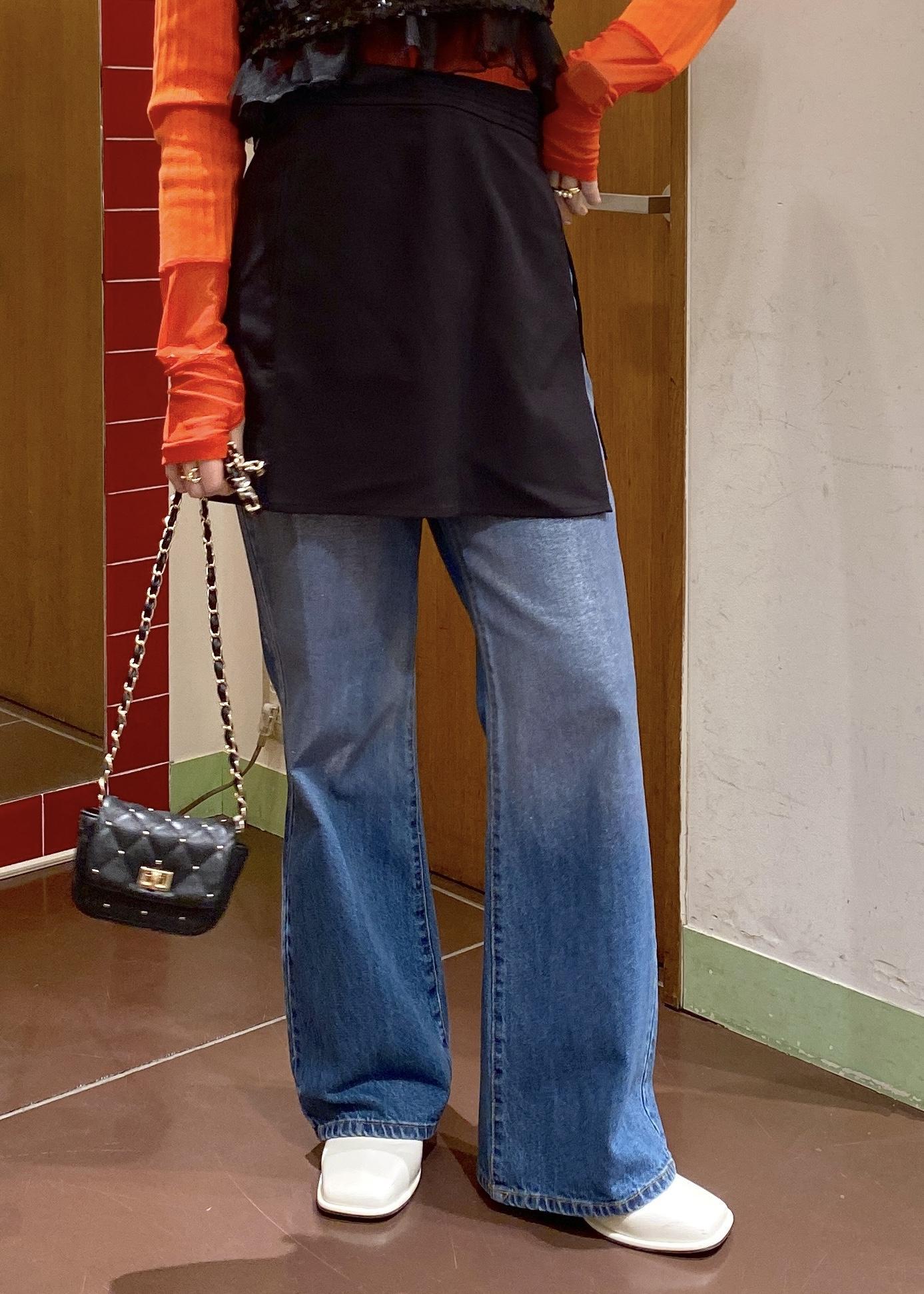 アウトレットVIS折り返しフレア箔デニムブルー系 / M¥2,198レビューデニムの生地が柔らかく立ち座りも楽です。ダボっとしすぎずハイウエストで着こなせてすっきり見えます。