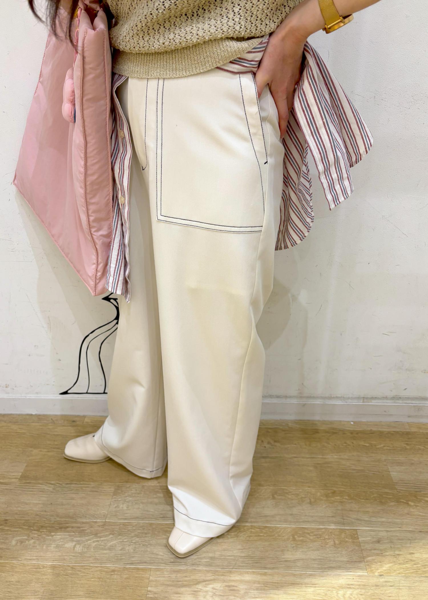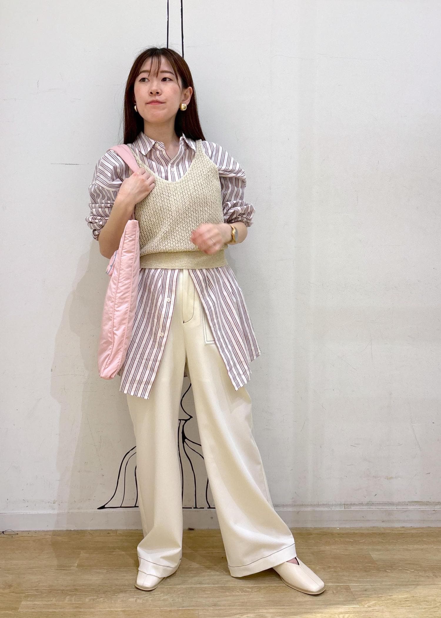 カラーはピンク系でまとめて、通勤や通学でも着れそうなコーディネートにしました。ビスチェとピンクのトートバッグがポイントです。