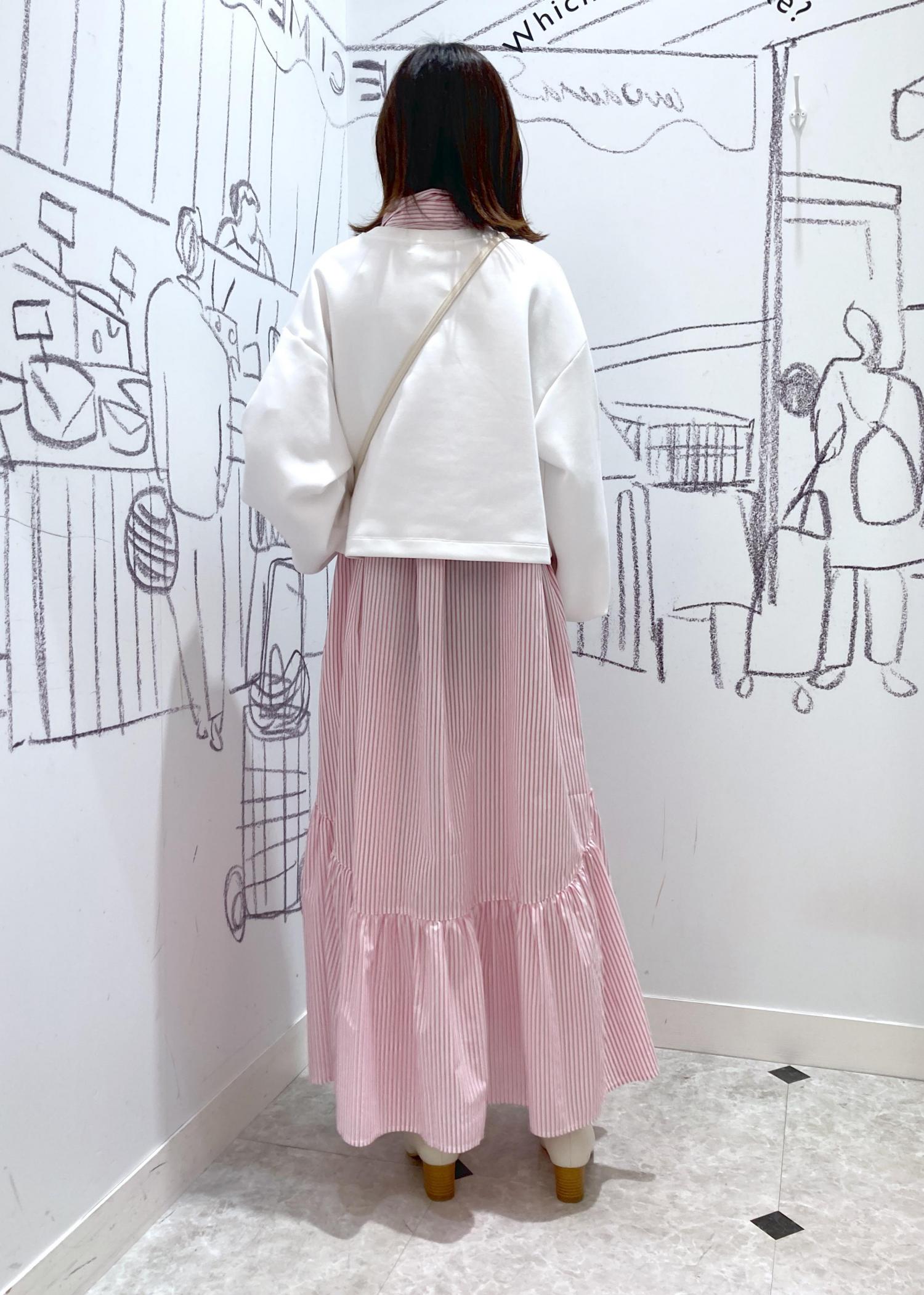 ピンクのストライプワンピースにトップスをレイヤードしてカジュアルな着こなしがおすすめのコーディネートです。
