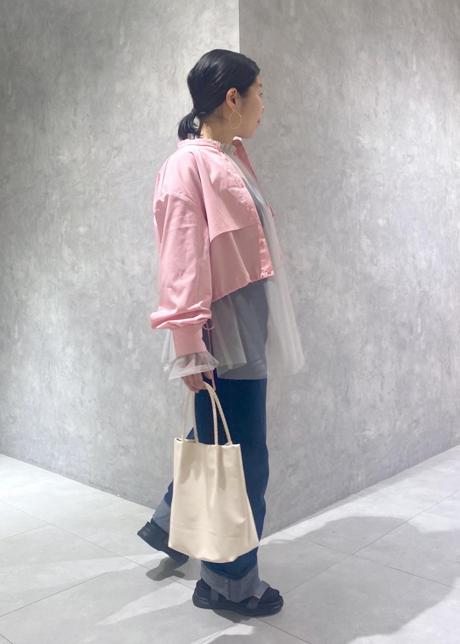 チュール×デニムの羽織にピンクのショート丈シャツを合わせました。羽織をショートにするとスタイルアップにもなります☆