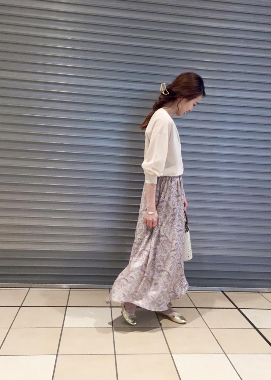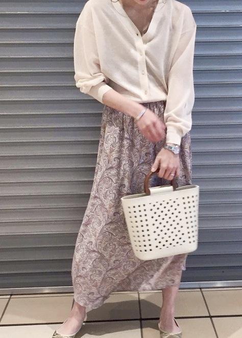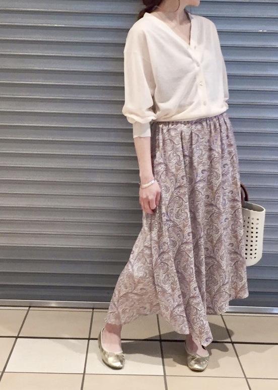 今年らしいシアーカーディガンに、ペイズリーのスカートで優しい女性らしいコーディネートです。 スカートはアシンメトリーなカットになっていて、揺れ感が出るのでカジュアルになり過ぎないデザインです。
