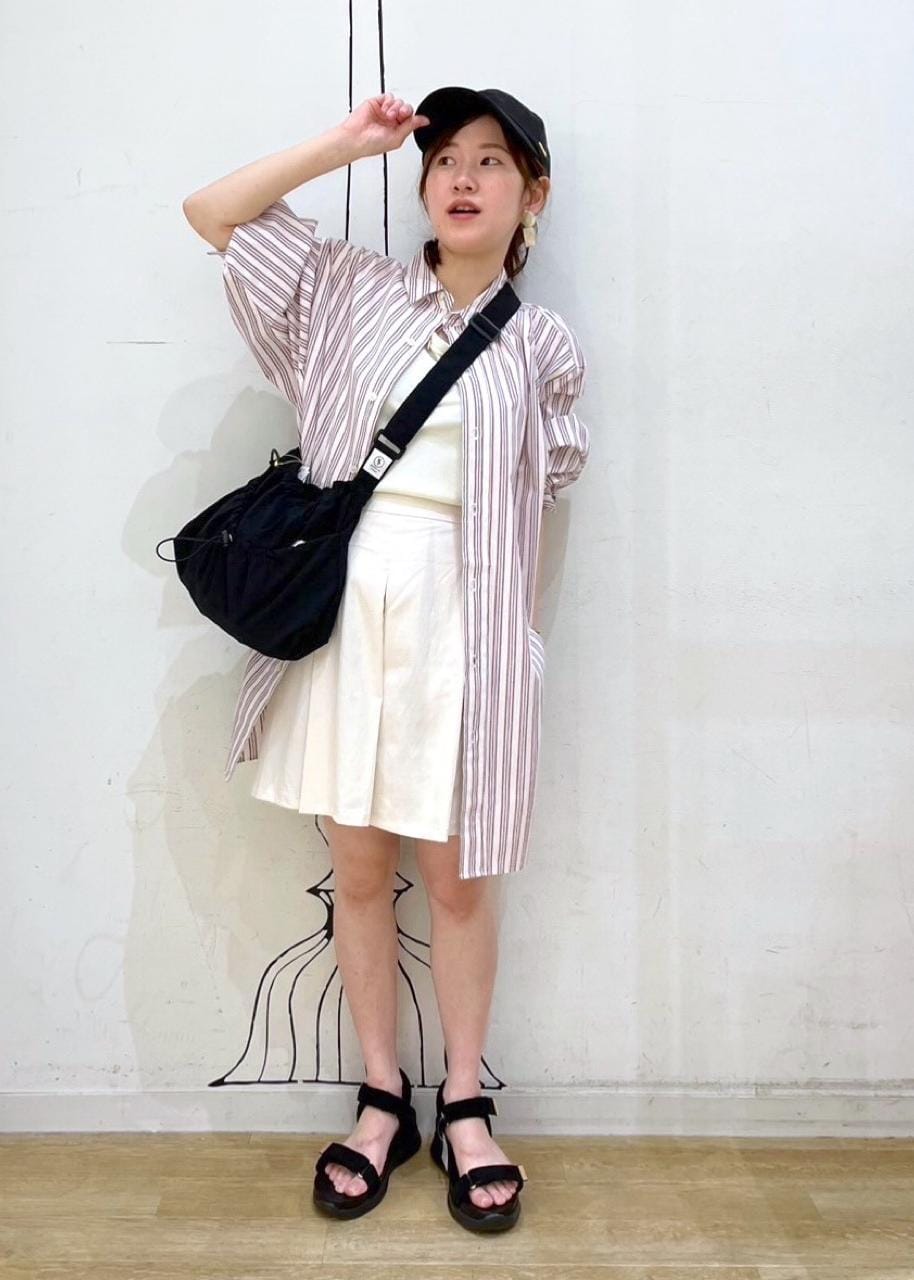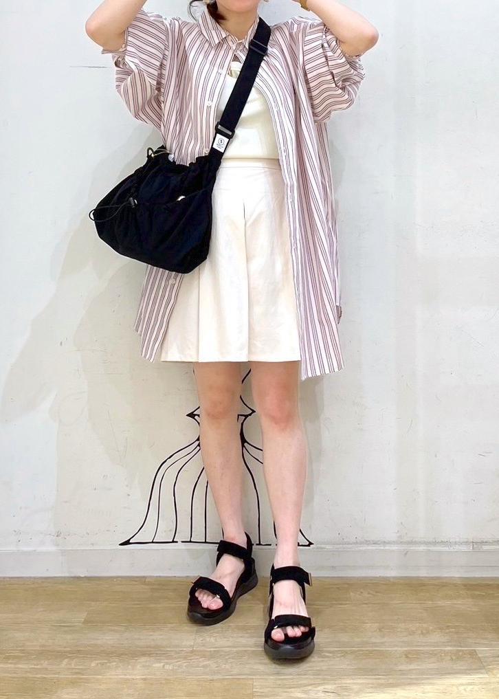 ショート丈のキュロットパンツにオーバーサイズなシャツと合わせた初夏コーデ。ロングシャツやオーバーサイズなアイテムと合わせるとショート丈ボトムスも甘くなりすぎず取り入れやすいです。