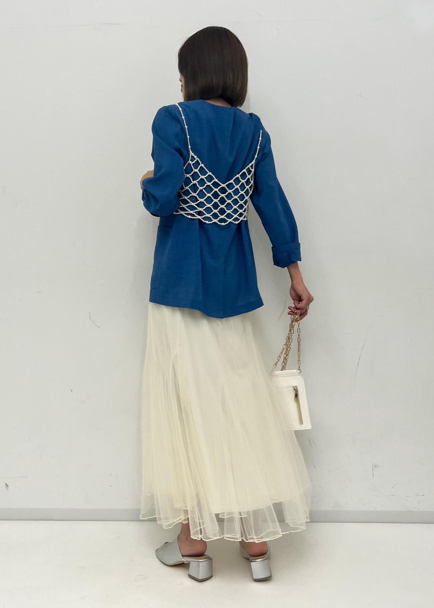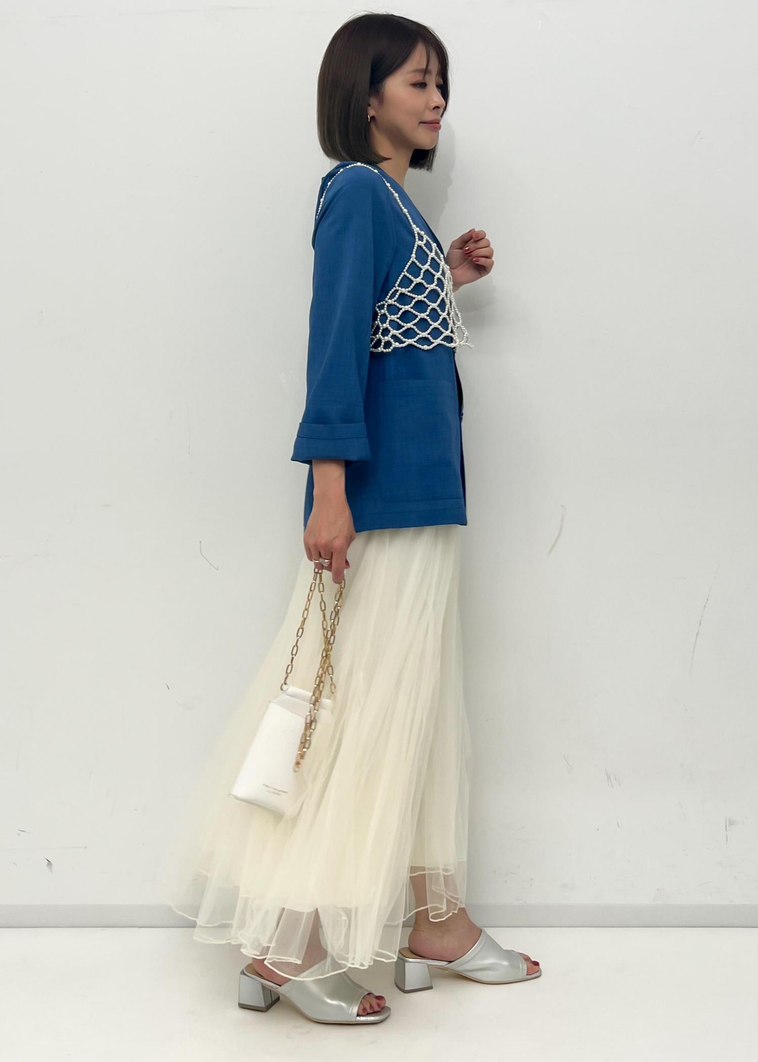 トレンド感のあるパールビスチェは、ジャケットの上から付ける着こなしもおすすめ。