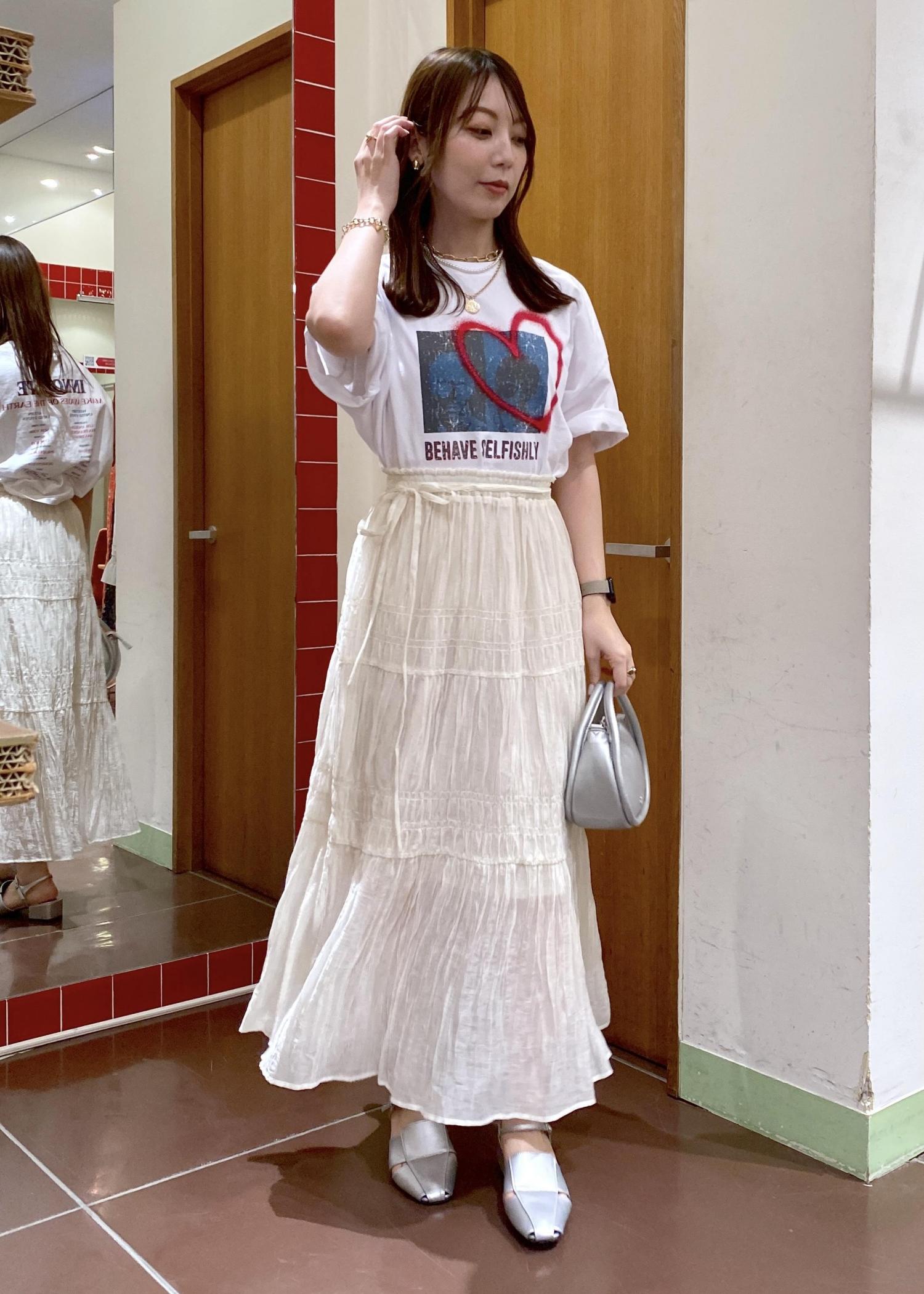 フェミニンコーデが好きですが、カジュアルも着てみたい!白のハートがついたTシャツだとカジュアルすぎず女性らしくも着こなせます。