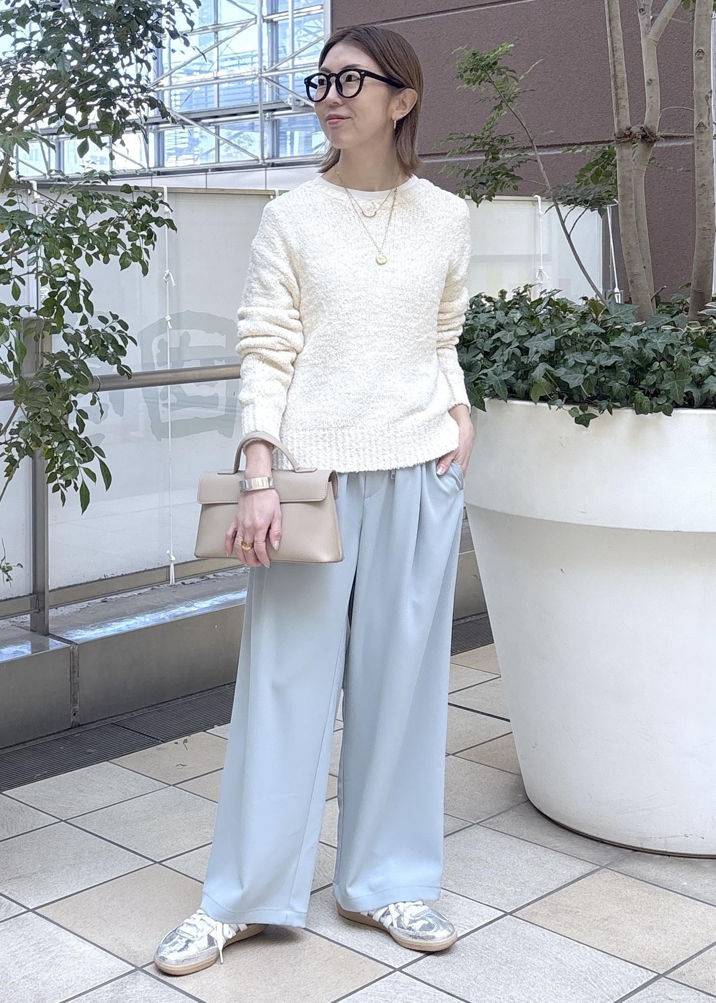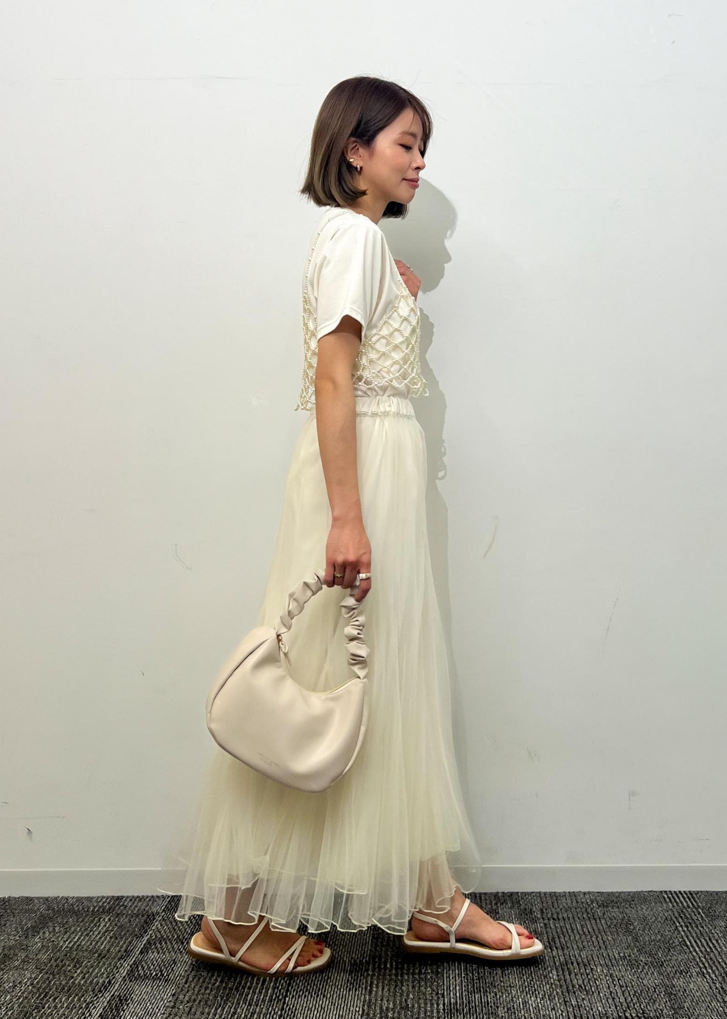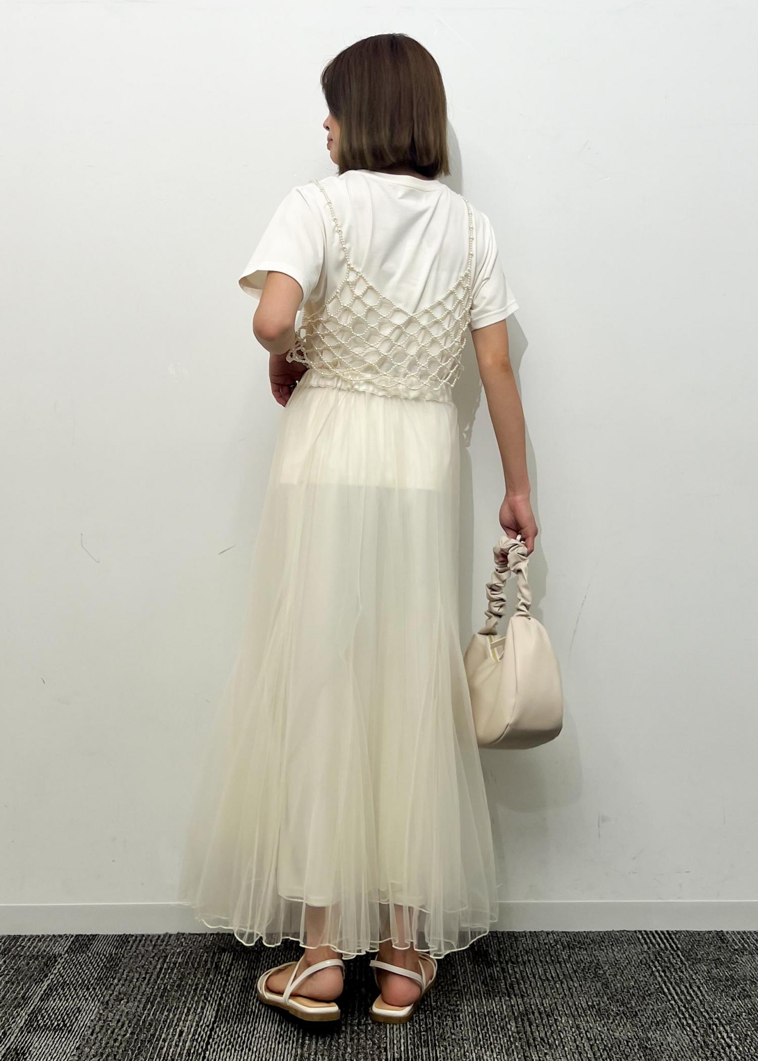 パールビスチェをTシャツに重ねて、トレンド感のあるスタイリングにしました。