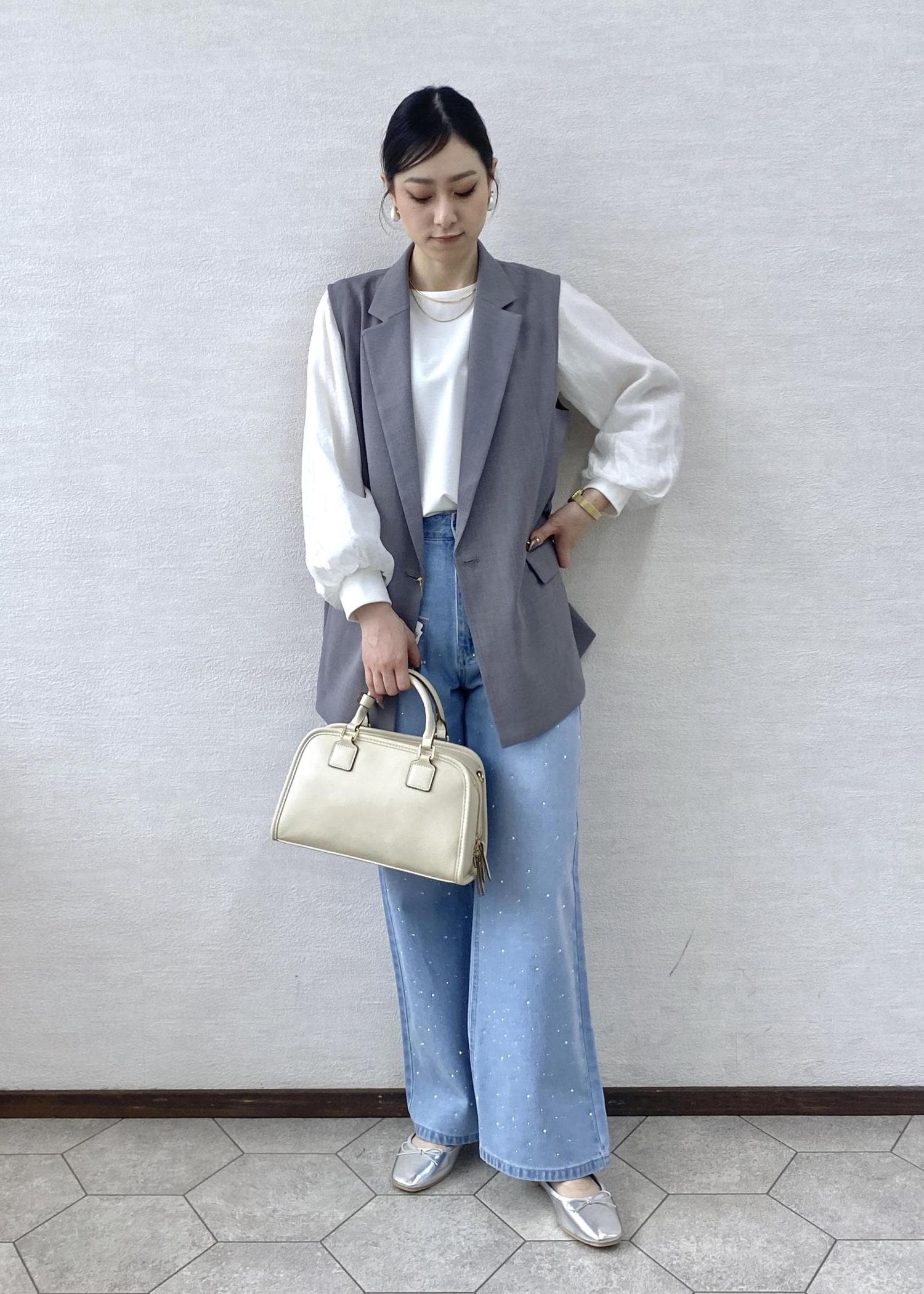 シアー素材で清涼感のあるカーディガンにホワイトパンツを合わせ綺麗めなコーディネートに。