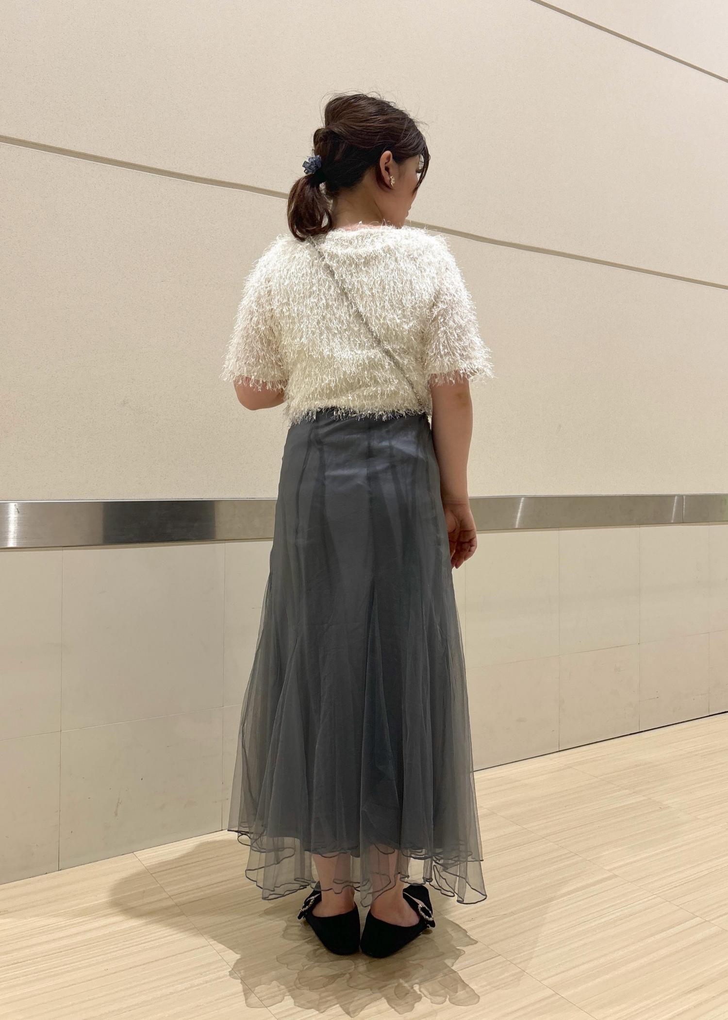 テープヤーンデザインのクロップドトップスにマーメイドデザインのチュールスカートを合わせて、夏まで使えるトレンドきれいめコーディネートに仕上げました!