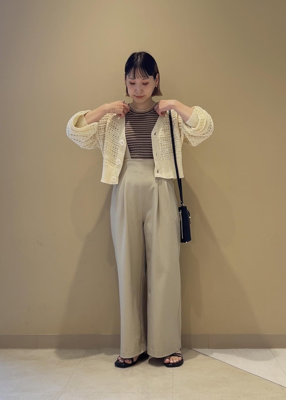 透かし編みのニットカーディガンをさっと羽織った、リラックス感のあるカジュアルスタイルです。