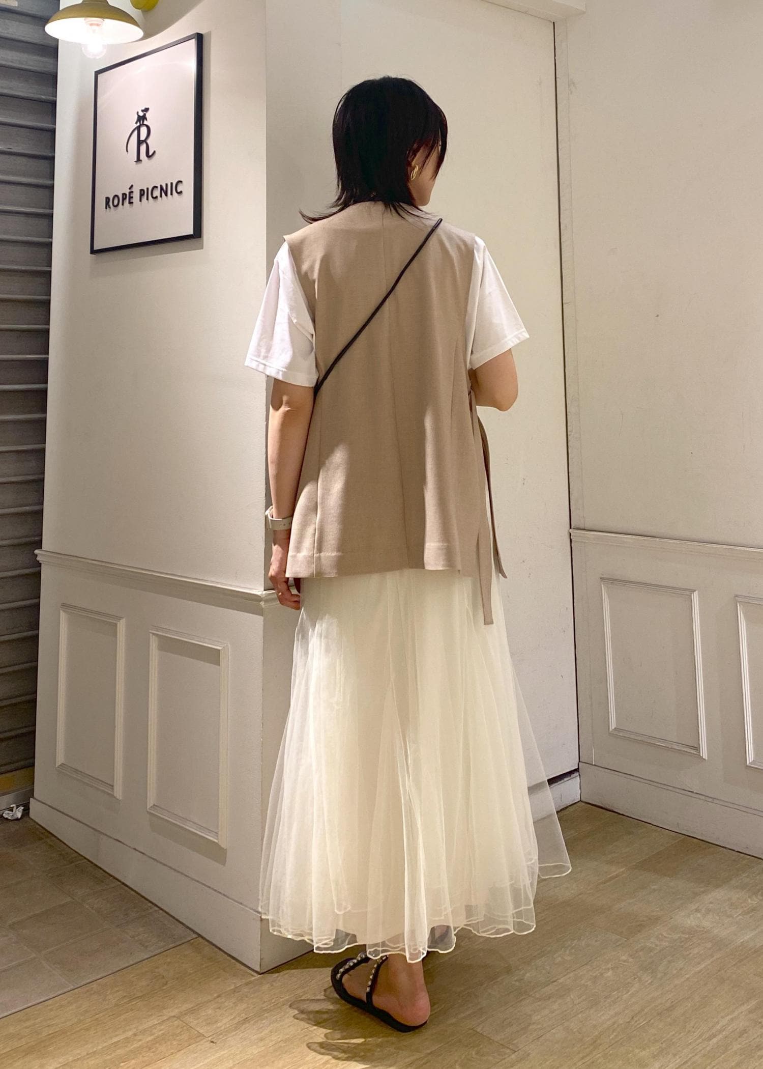 ロゴTeeとベストのカジュアルスタイルに、チュールスカートで甘さをプラス♪甘過ぎない大人カジュアルコーデです。