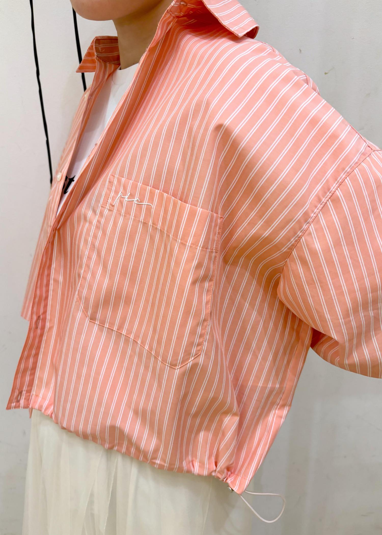 オレンジのストライプシャツが春夏にぴったりです。