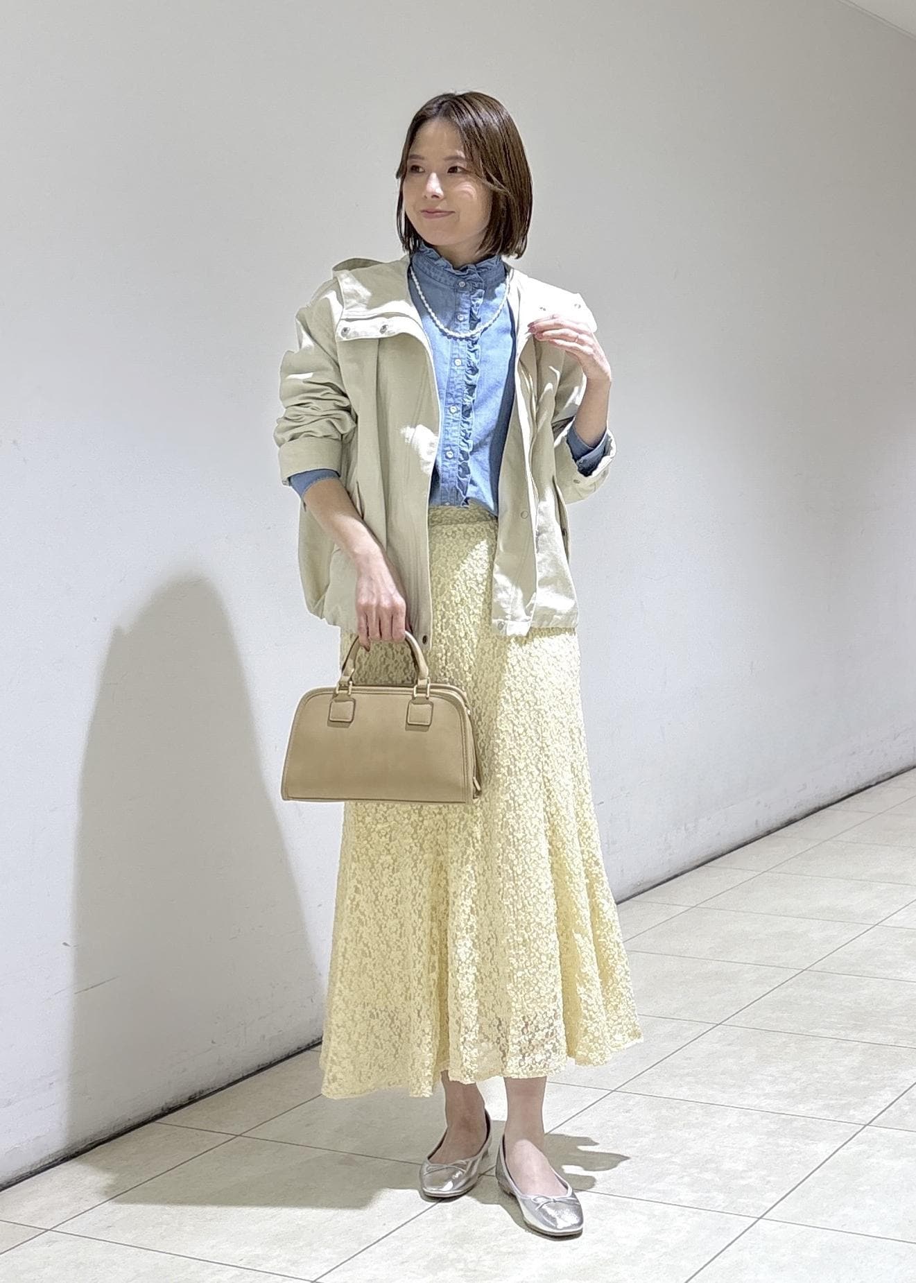 ベージュのワントーンコーデ+差し色でブルーのバッグを持ち夏らしい涼しげなコーディネートにしました。