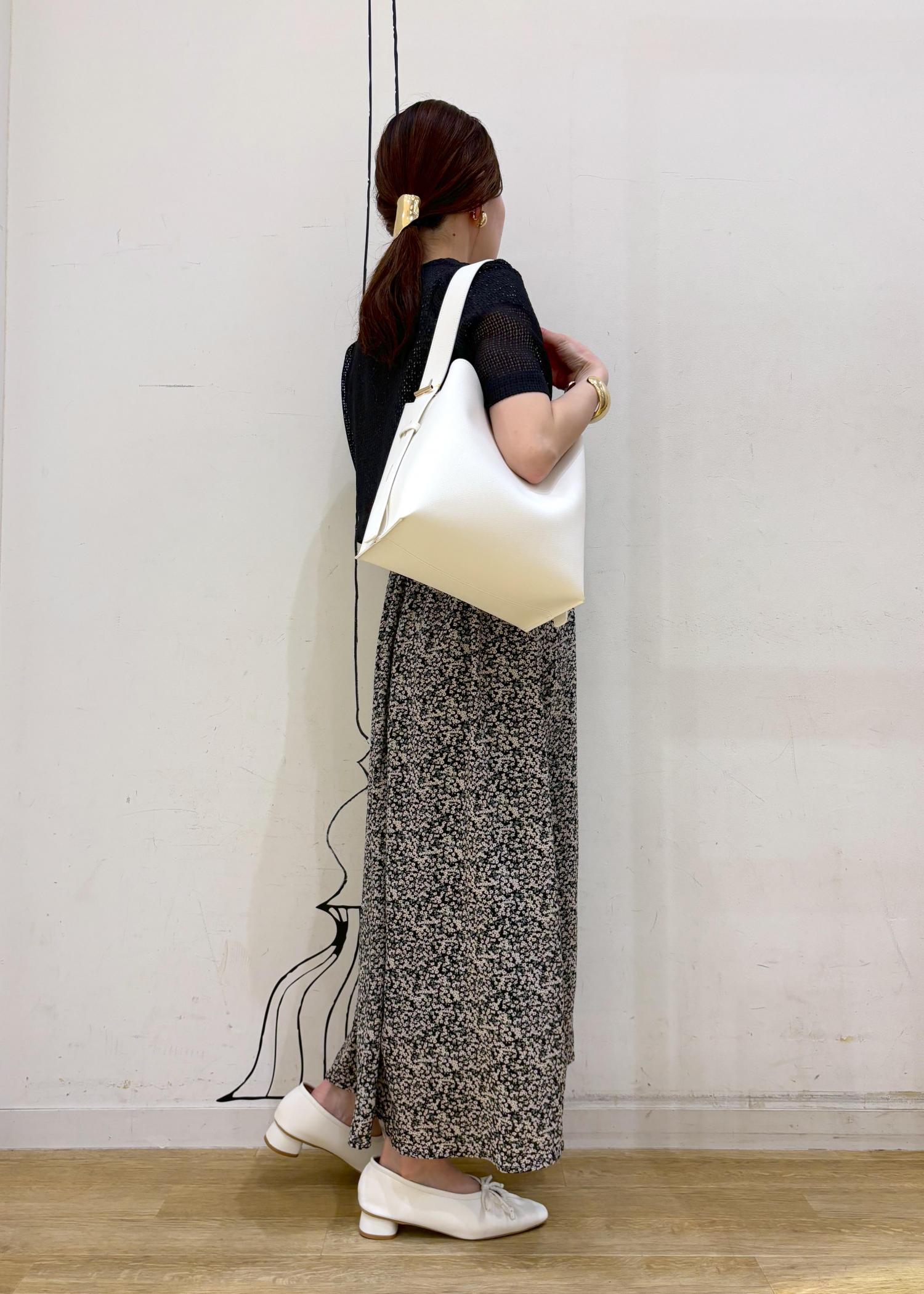 デイリーにも着れる花柄ワンピースに金ボタンジャケットを閉じて着で綺麗めコーデに。シックな色合いなので小物は白で統一しポイントに。