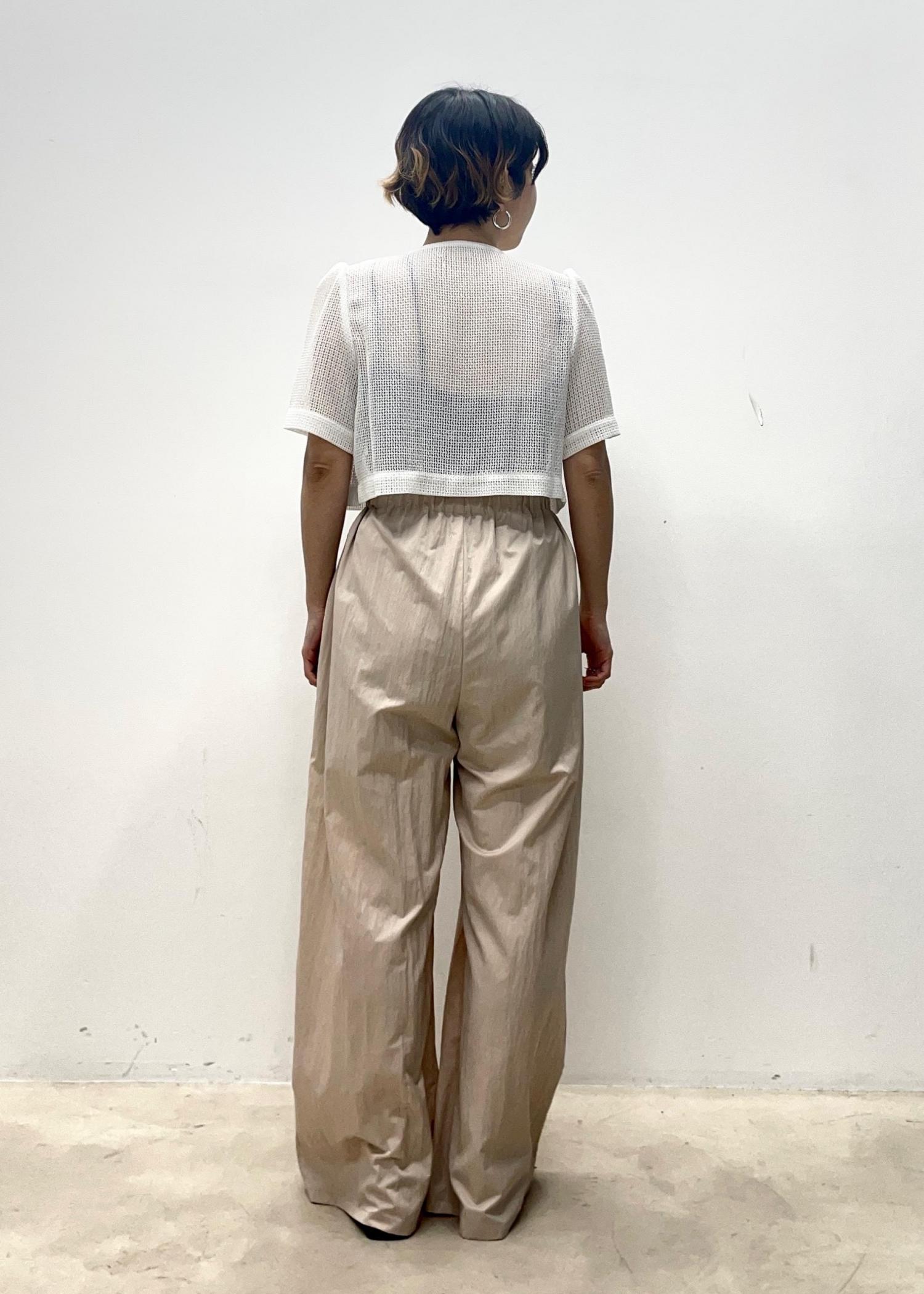 シャカシャカとしたナイロン素材で、ワイドシルエットなのでコンパクトなトップスと相性◎ -