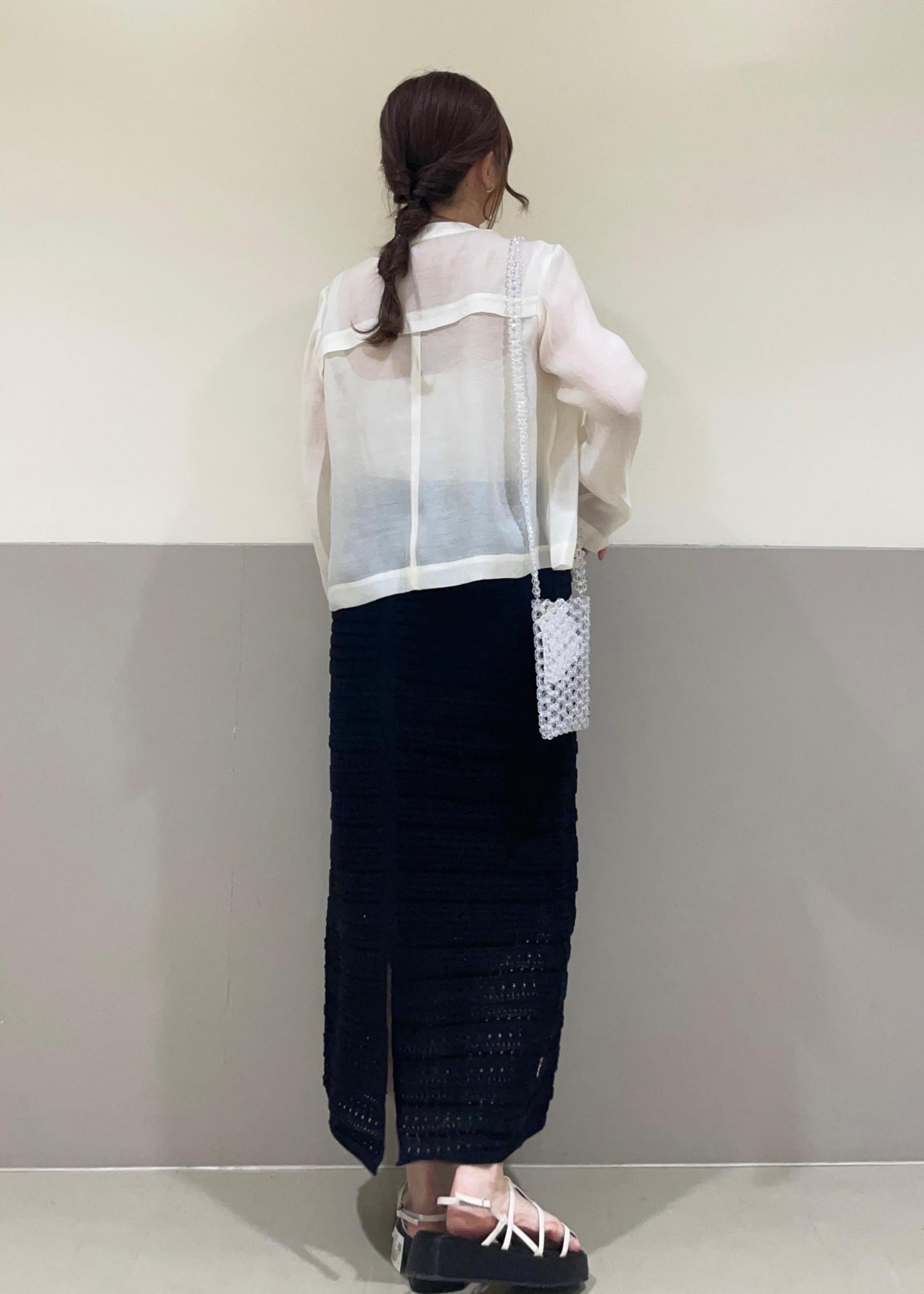 シアー素材を活かし、タンクトップ合わせでデコルテをすっきり見せることで着痩せ効果も◎