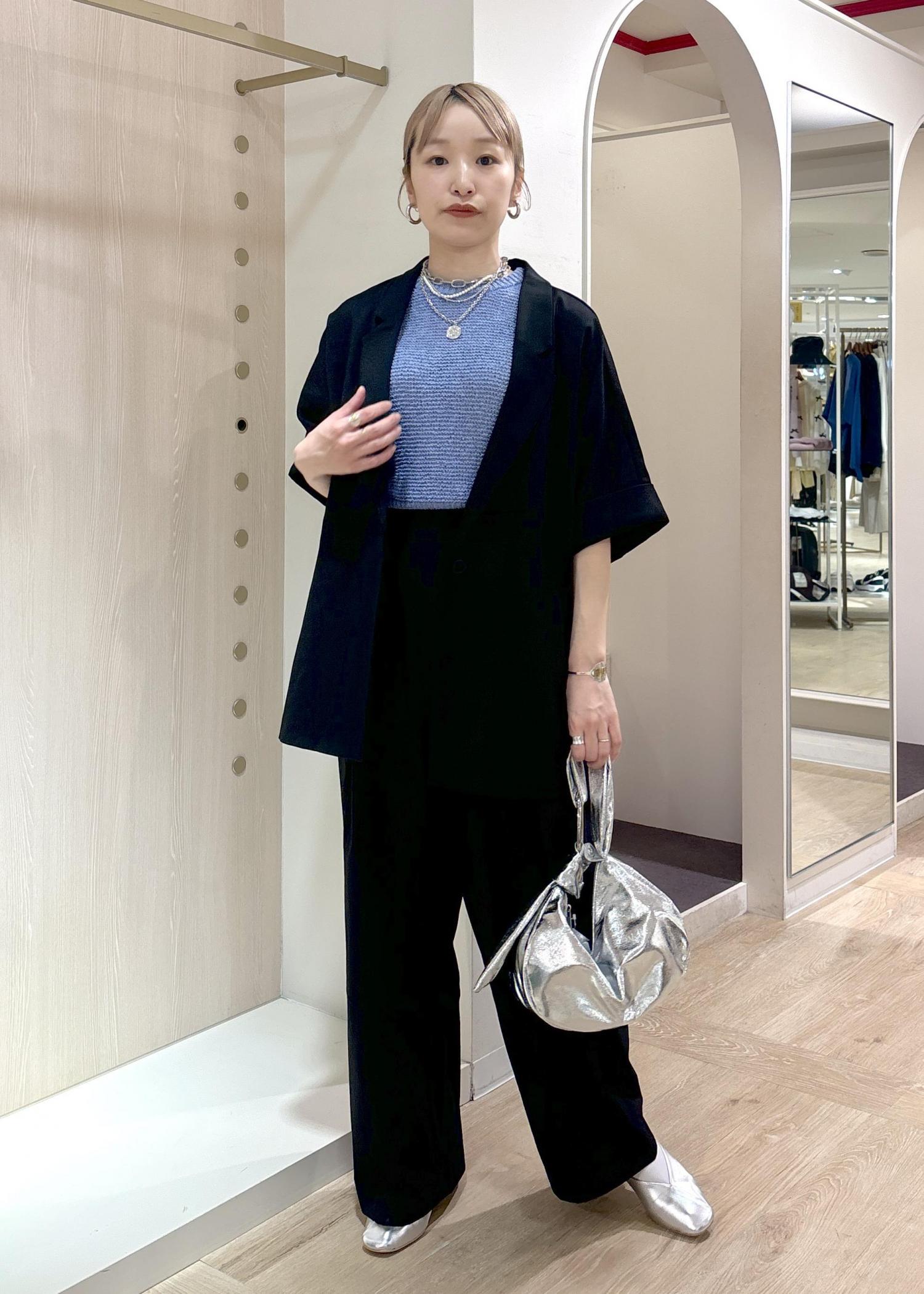 インナーに涼しげなニットを合わせた、大人ジャケットコーディネートです。