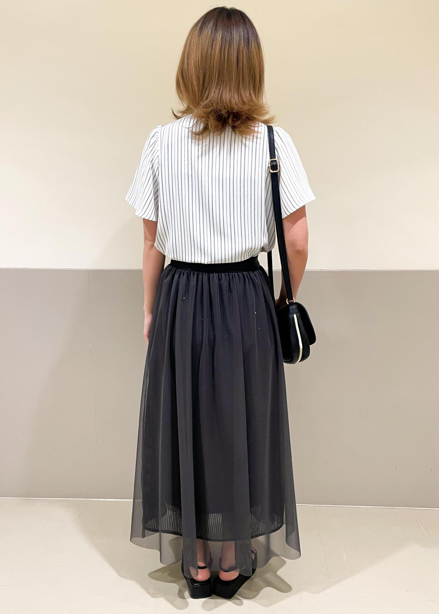 きれいめブラウスとスパンコールがレイヤードされたスカートを合わせて、上品かつ華やかなコーディネートにしました!